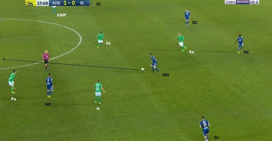 ... à destination du même ailier, toujours placé entre les lignes (nos deux lignes de 4 sont bien visibles). Cette fois-ci la pression défensive ne vient pas de Perrin, mais de Hamouma, qui arrive à lui prendre le ballon...