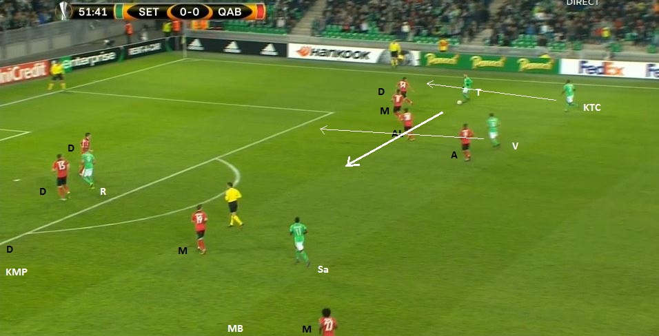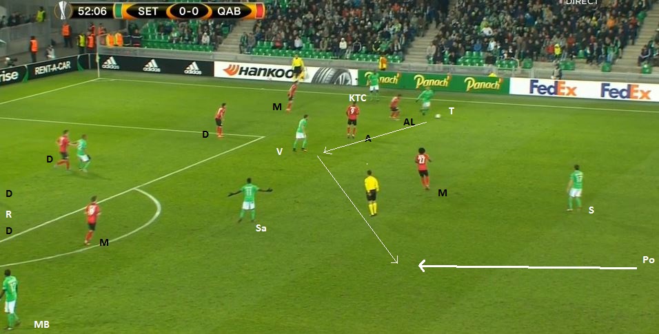 Le ballon est dans la défense, on prépare une attaque placée. On peut bien voir la première partie du bloc adverse (4-1-4-1) avec le milieu défensif, la ligne de quatre milieu et l'avant-centre, ainsi que le double piston de nos deux milieux relayeurs, Veretout descendant offrir une option à Lacroix et Saivet y allant vers la défense. Mais surtout on voit Tannane qui se place dans la zone de la sentinelle (MD - milieu défensif) adverse, appelant avec ses bras les ballon.