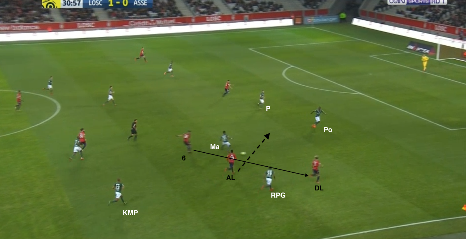 ... pas suivi par KMP (remarquez comment ils étaient un à côté de l'autre sur la capture précédente et la distance qui les sépare 3 secondes plus tard). Le latéral lillois reçoit le ballon, l'ailier lui propose une solution...