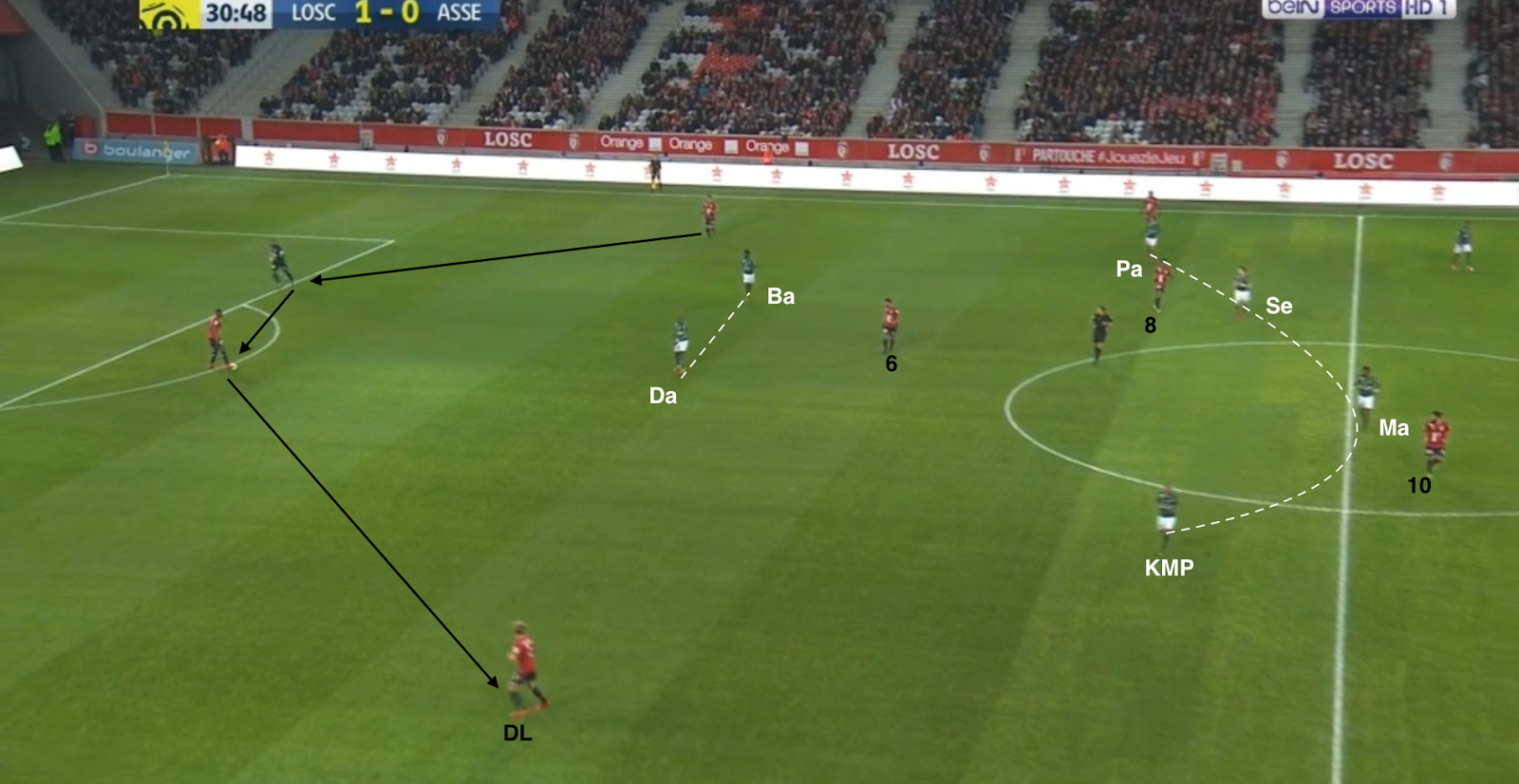 Ce 4-4-1-1 des Verts a du sens quand on regarde Lille jouer. Même si théoriquement ils jouent en 4-2-3-1, le triangle au milieu est plutôt pointe basse quand ils ont le ballon (ce qui arrive très souvent, Lille ayant la meilleure possession de L1 après le PSG). La sentinelle (le "6") est l'organisateur du jeu et il y a 4 joueurs (les deux ailiers, le "8" et le "10") qui sont prêts à recevoir le ballon. Le choix stéphanois a donc été de faire un marquage individuel sur le 6 - le rôle de Dabo - et de mettre une ligne de 4 milieux, une ligne très serrée, même les deux excentrés Pajot et KMP étant plus dans l'axe que sur le côté.