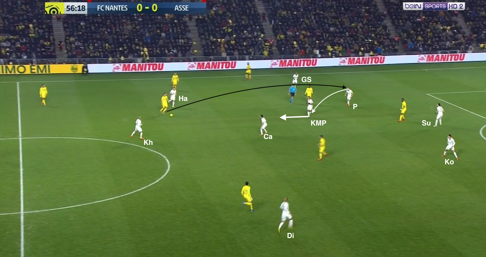 Le ballon est dans les pieds d'un défenseur adverse, Hamouma coupe l'angle de passe vers le latéral droit, Diony surveille le gauche, la défense gère les trois attaquants et M'Vila, Cabella et Khazri proposent un triangle pointe haute qui colle aux milieux axiaux nantais. Sauf que Cabella quitte sa zone pour monter sur le défenseur central (un pressing d'attaquant), oubliant le milieu dans son dos, qui reçoit le ballon et qui lance en première intention le latéral dans son couloir. Hamouma n'avait pas suivi, mais KMP si, arrivant à repousser le ballon en touche. La remise en jeu et quelques passes envoient le ballon sur le côté opposé :