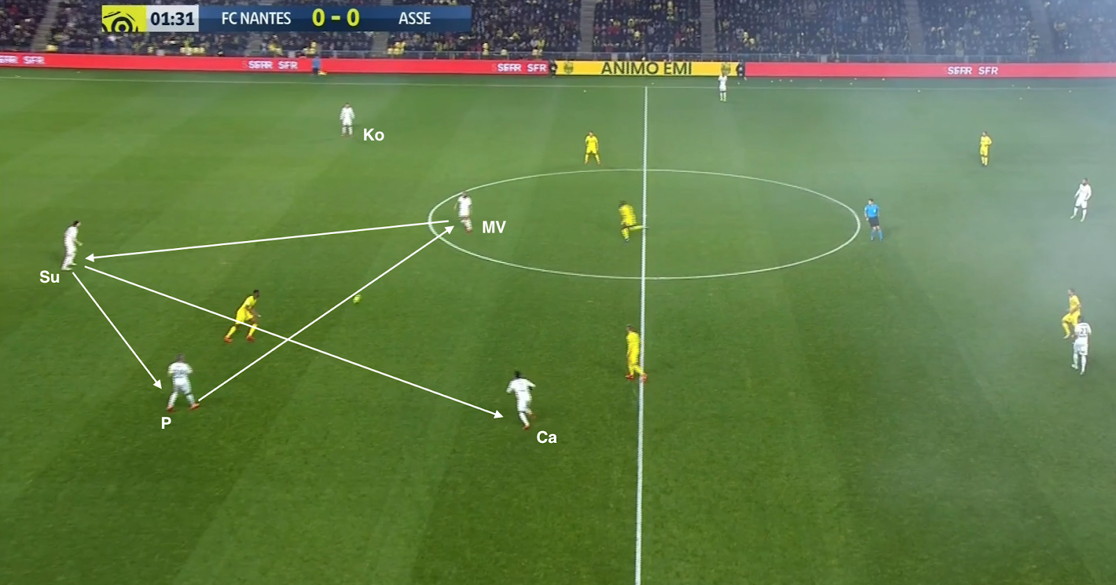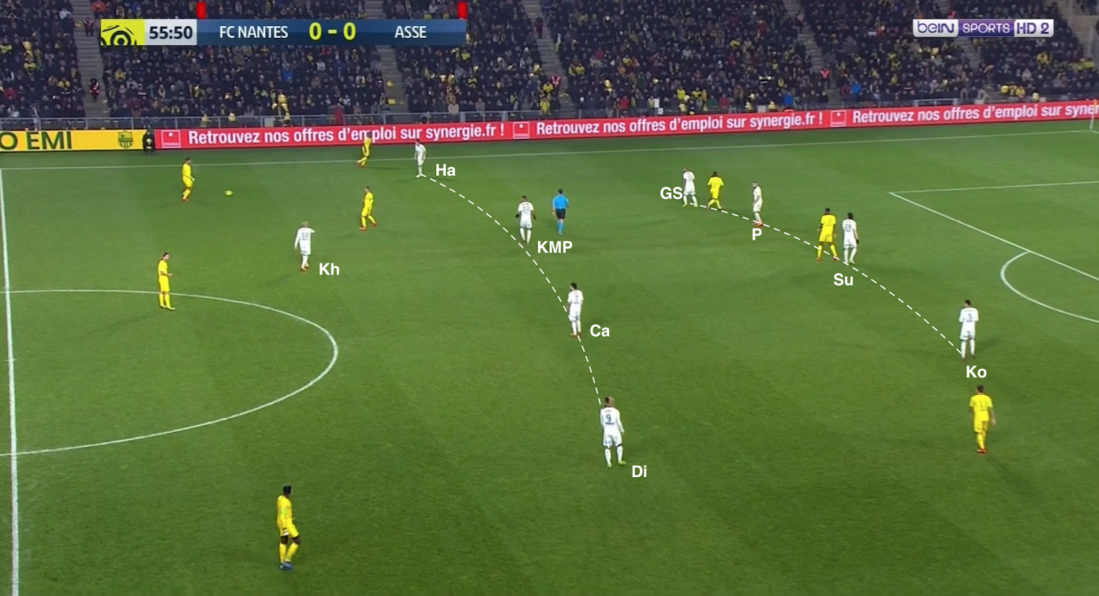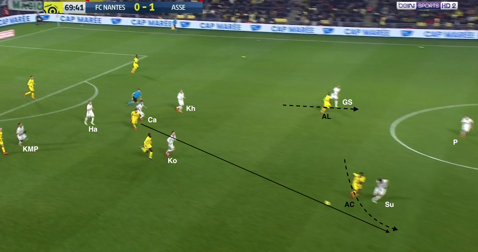 Mais ça n'a pas toujours suffit et les Nantais ont pu profiter de certaines erreurs de placement dans le bloc stéphanois. Par exemple à la 35e :