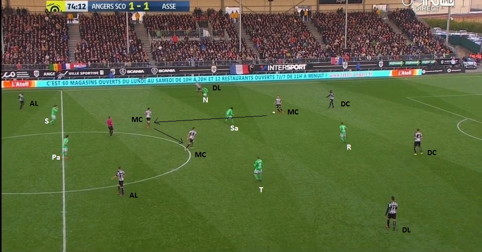 On compte en ce moment 5 Angevins pour 6 Stéphanois, dont Saivet bien démarqué et Malcuit qui arrive dans son dos. Il est évident comment il faut jouer la suite :