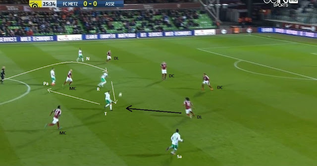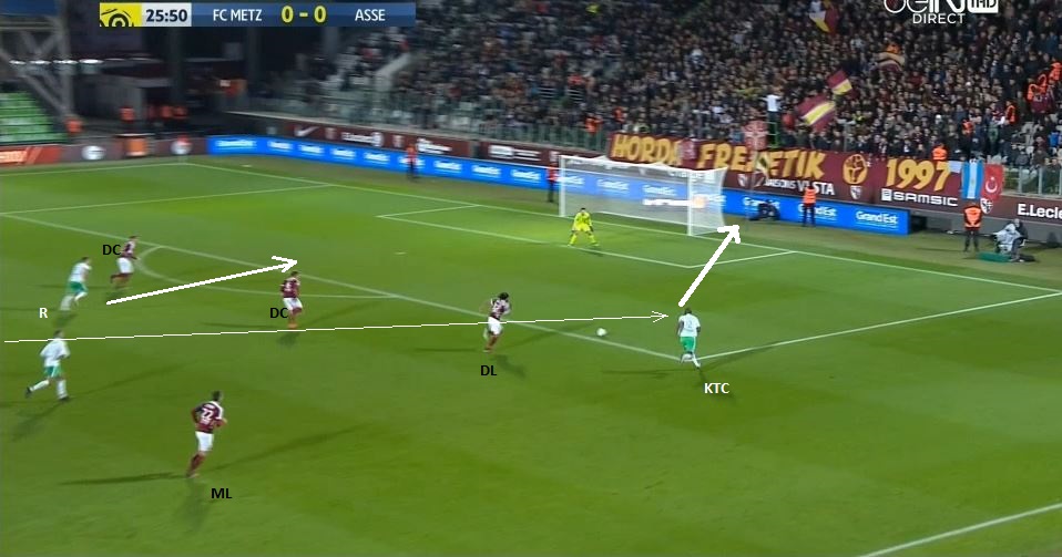 Sur la capture suivante, on voit bien les deux lignes de 4 de Metz, ainsi que l'appel classique de Tannane, de son côté vers l'axe, qui aspire parfaitement le latéral (BAE) et qui libère ainsi le couloir pour KTC :