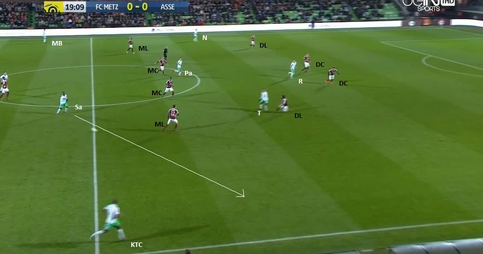 On remarque de nouveau le positionnement en "10" de Tannane, ainsi que le grand espace autour de Saivet. Cependant, le ballon ne lui parvient pas, Pajot joue avec Veretout, en retrait pour Perrin, Lacroix, de nouveau Veretout, le premier rideau messin est de nouveau dépassé :
