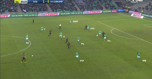Le un-deux entre Malcuit et Tannane fonctionne parfaitement et à eux deux ils ont pris 4 adversaires : deux défenseurs éliminés pas la passe de Tannane, l'ailier qui suit Malcuit et la sentinelle qui doit couvrir :