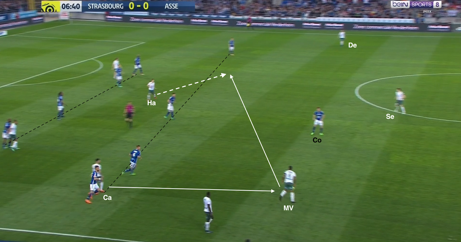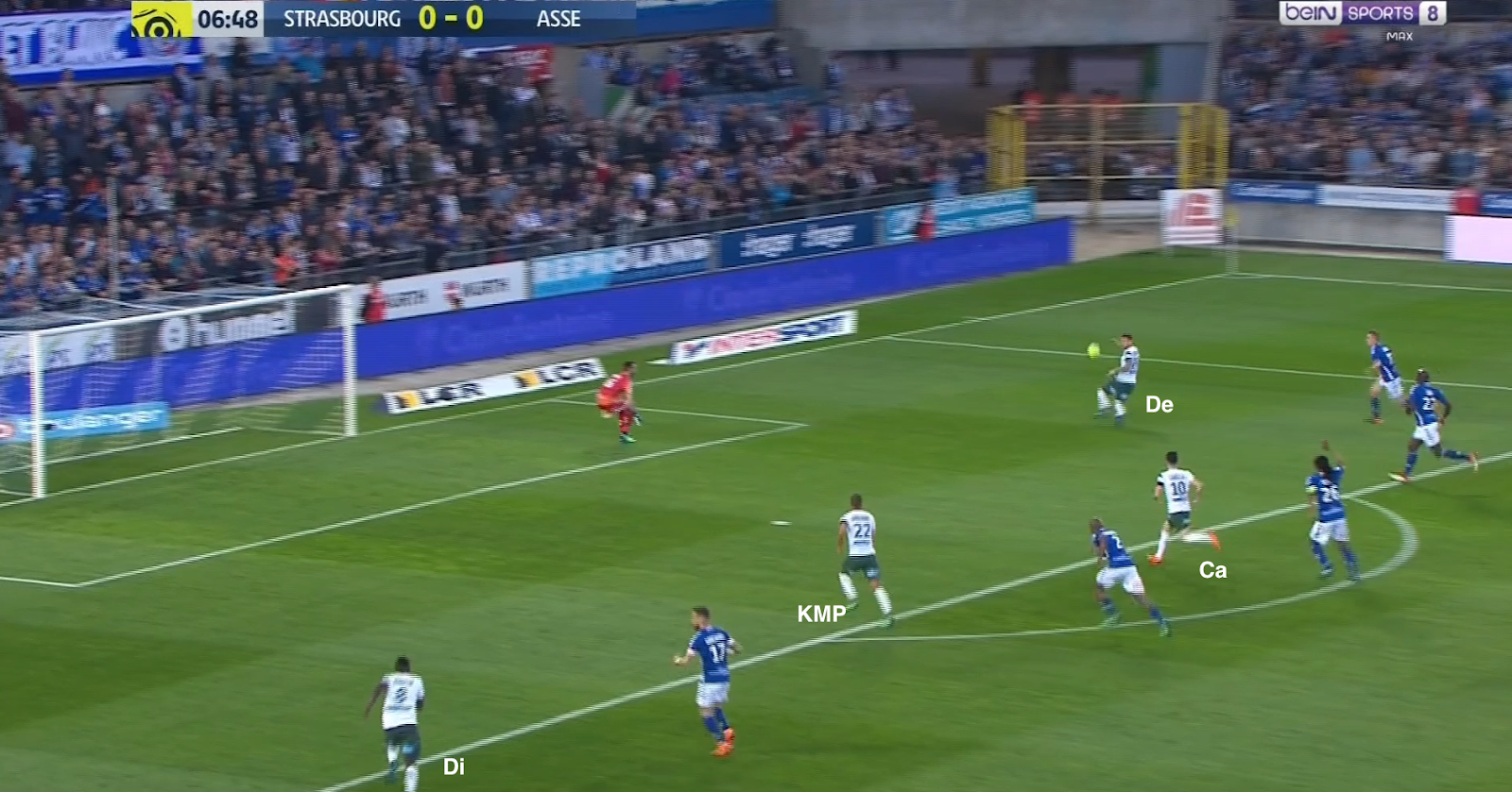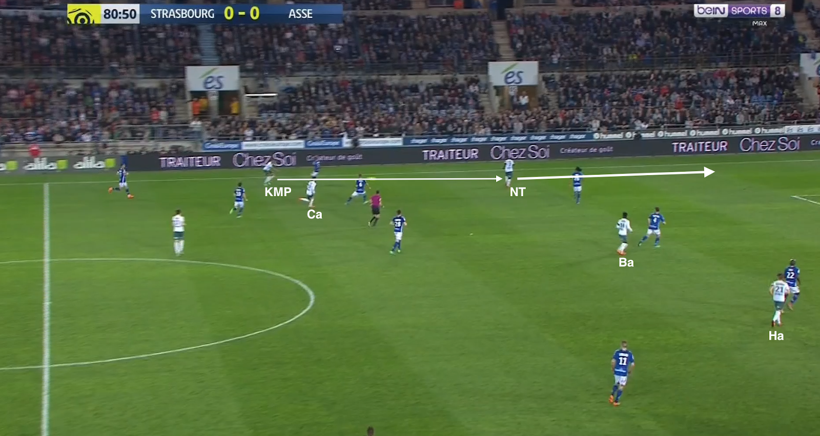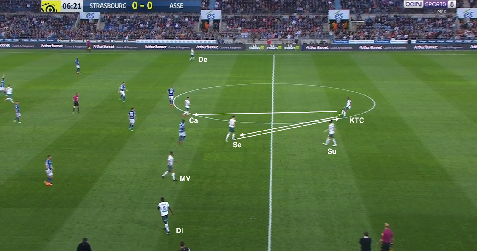... et les Stéphanois font tourner le ballon dans la défense, tranquilles - Strasbourg n'effectuant pas de pressing haut à ce moment du match. KTC, Subotic, M'Vila... le ballon est envoyé au latéral gauche KMP :