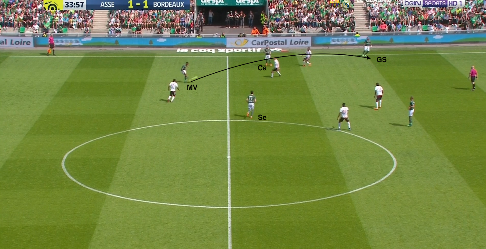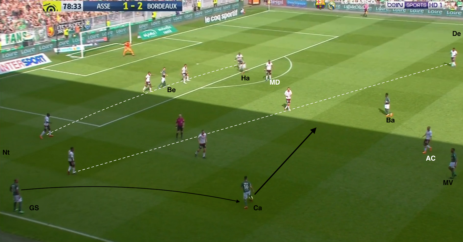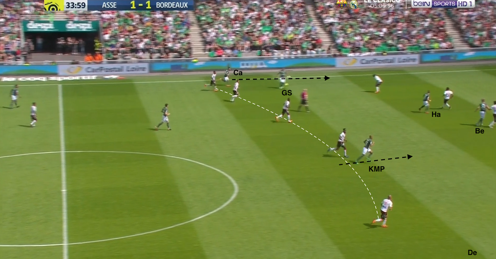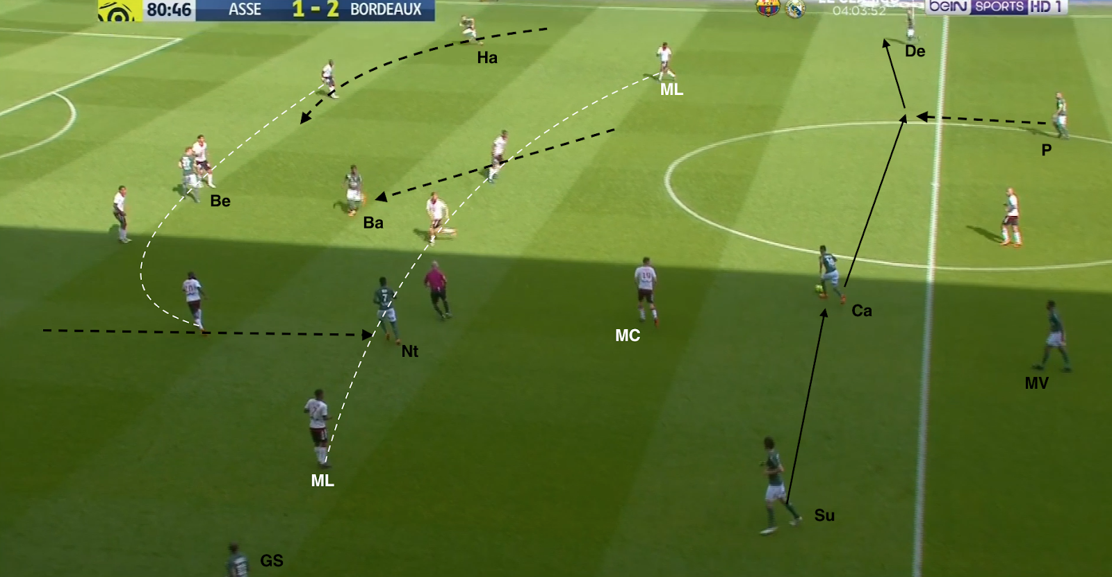 Perrin se trouve dans une position de meneur de jeu (et Cabella de défenseur central). L'adversaire qui se trouve à terre n'a pas d'influence sur cette action, il y a trois stéphanois autour de lui (M'Vila, Cabella et Subotic). Il y a des 2-contre-2 dans chaque couloir, Beric est entouré de 3 adversaires... il n'y a aucun décalage fait, sauf que l'appel de Bamba est parfaitement effectué dans l'espace libéré par le latéral adverse, tout comme la passe du capitaine, qui le trouve à l'entrée de la surface. Malheureusement sa frappe trouve le poteau...
