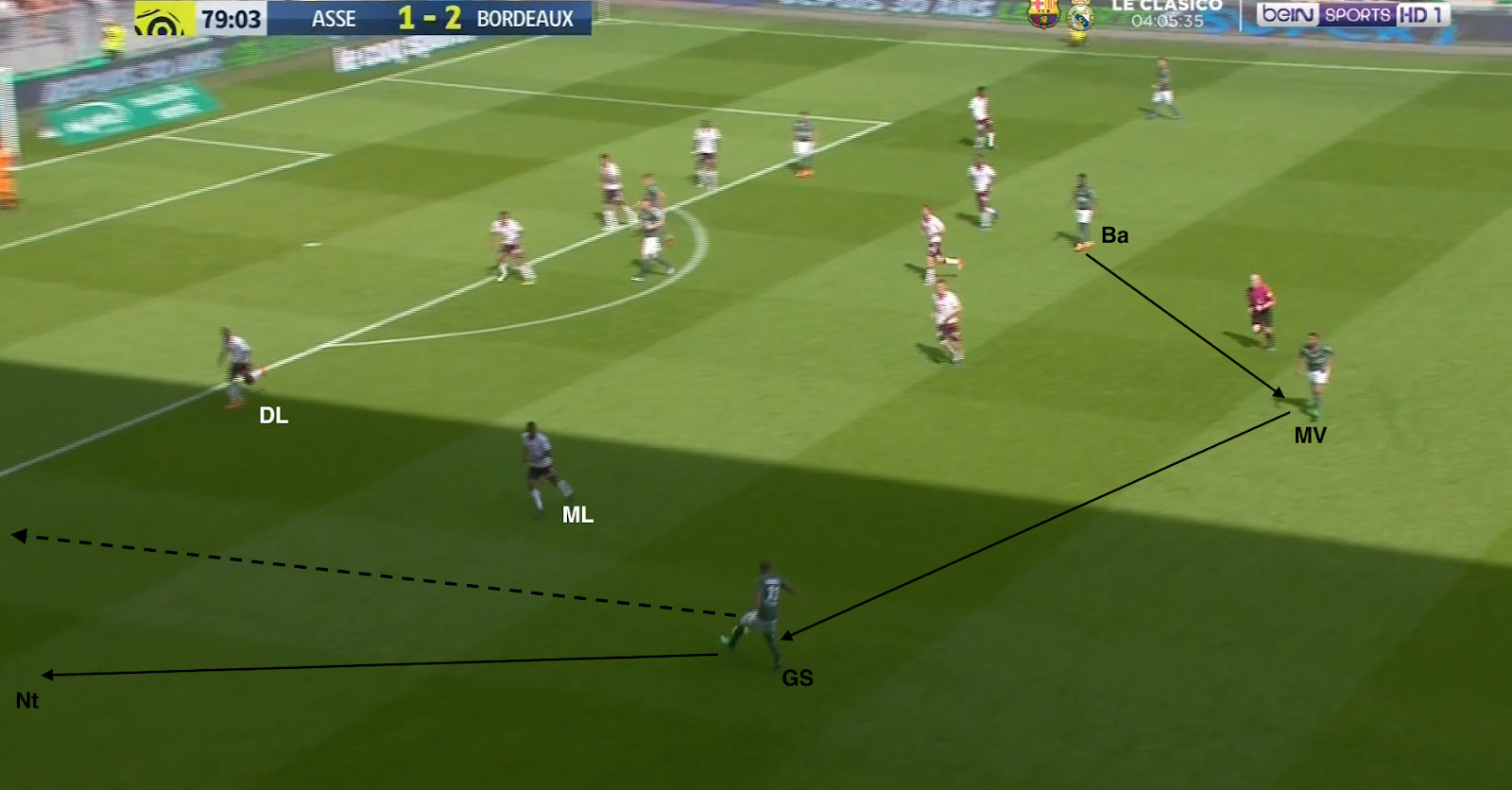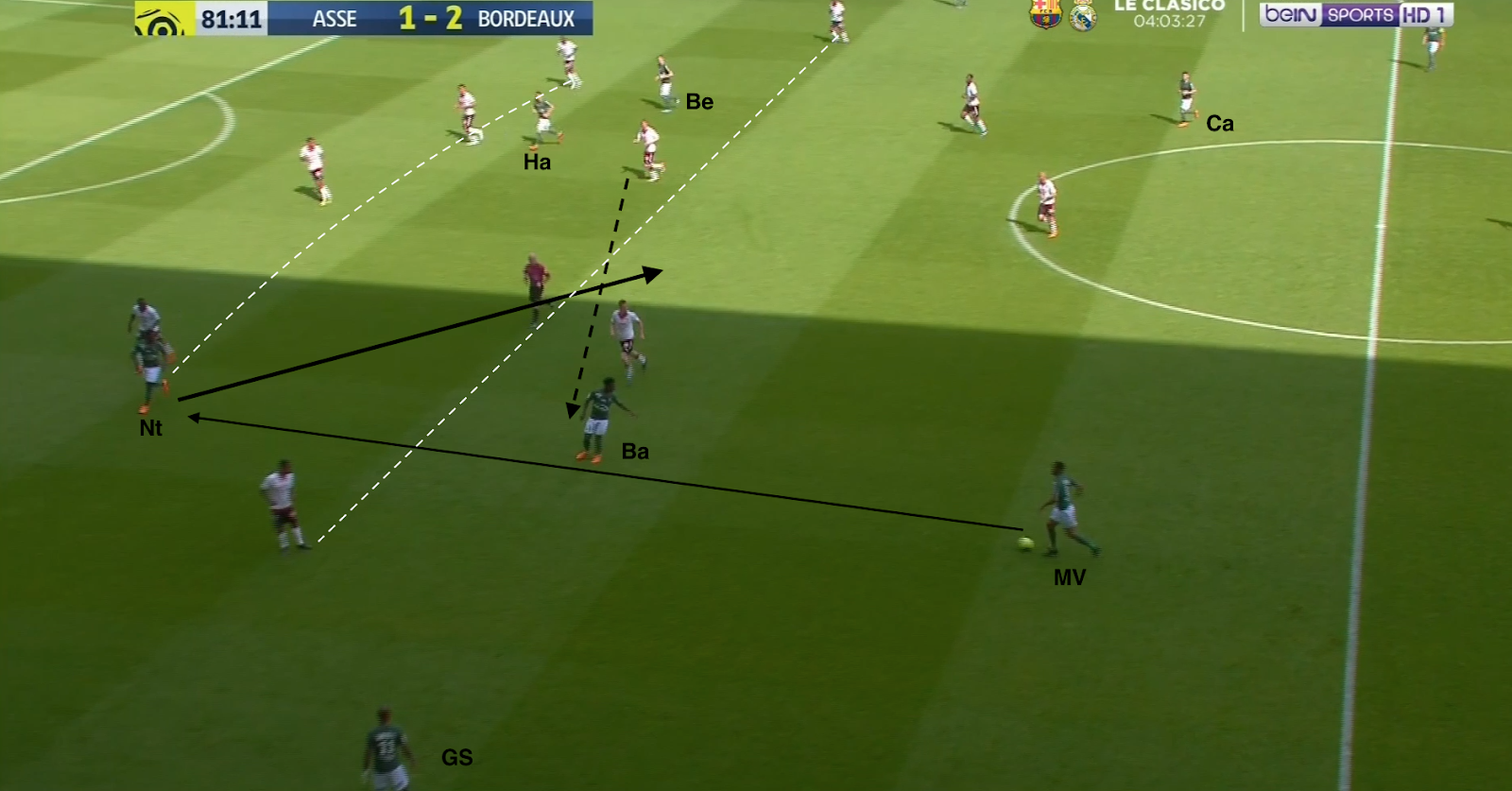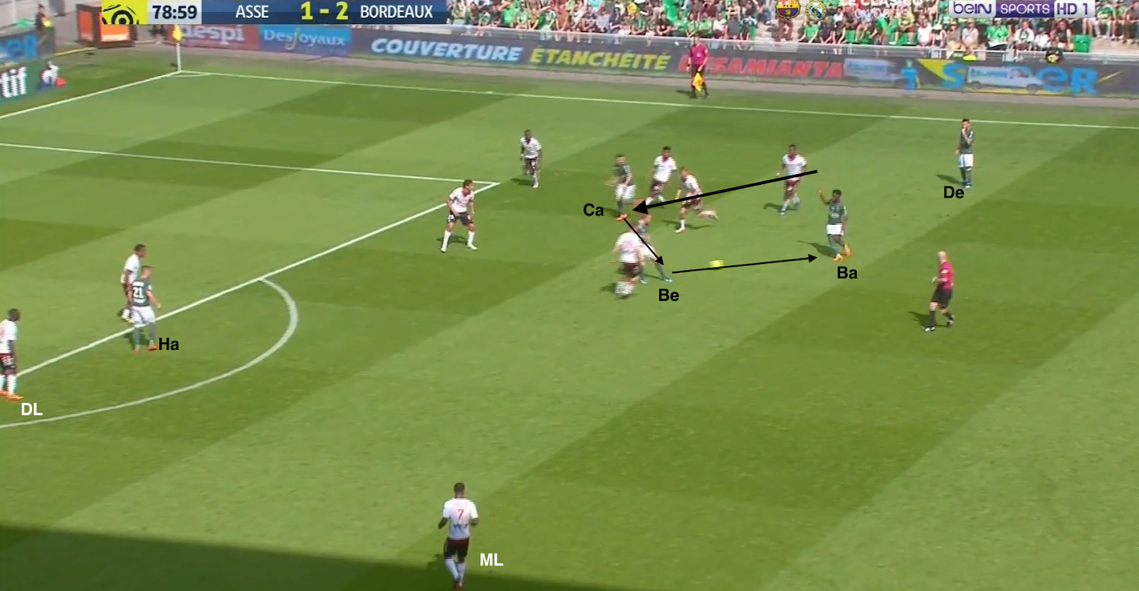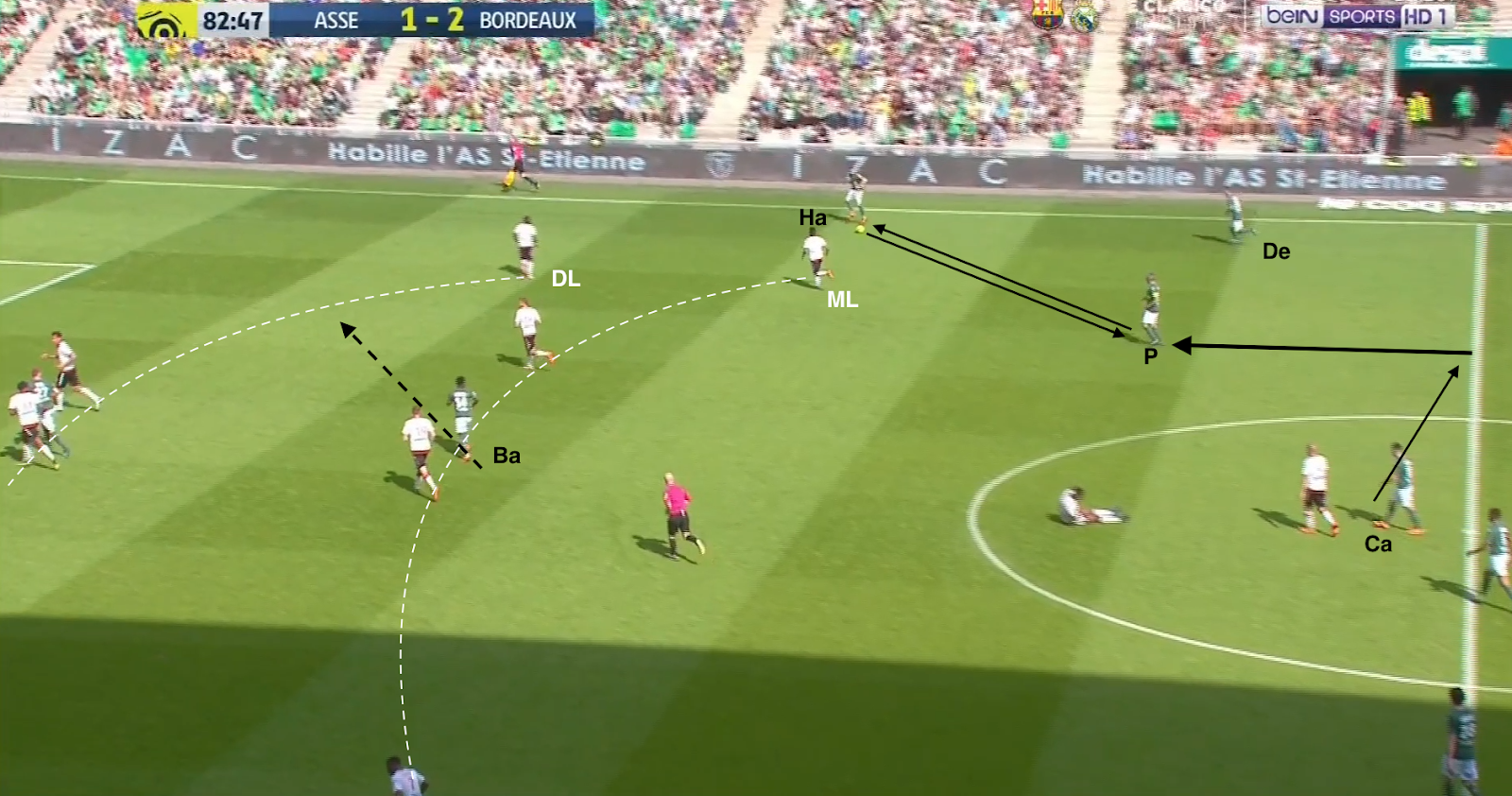 Perrin se trouve dans une position de meneur de jeu (et Cabella de défenseur central). L'adversaire qui se trouve à terre n'a pas d'influence sur cette action, il y a trois stéphanois autour de lui (M'Vila, Cabella et Subotic). Il y a des 2-contre-2 dans chaque couloir, Beric est entouré de 3 adversaires... il n'y a aucun décalage fait, sauf que l'appel de Bamba est parfaitement effectué dans l'espace libéré par le latéral adverse, tout comme la passe du capitaine, qui le trouve à l'entrée de la surface. Malheureusement sa frappe trouve le poteau...