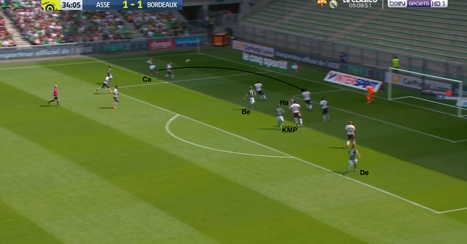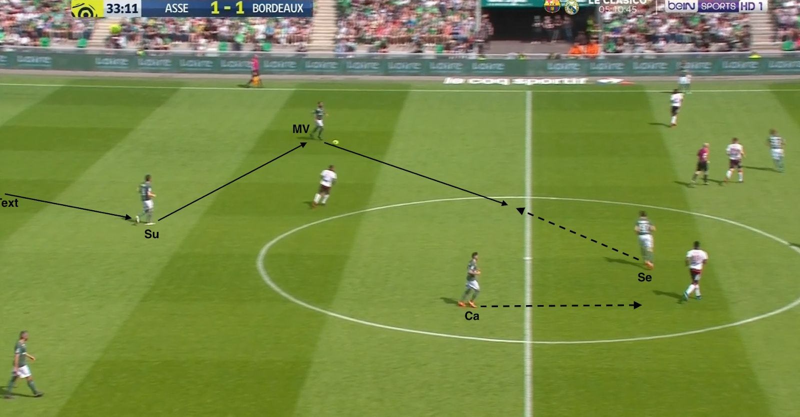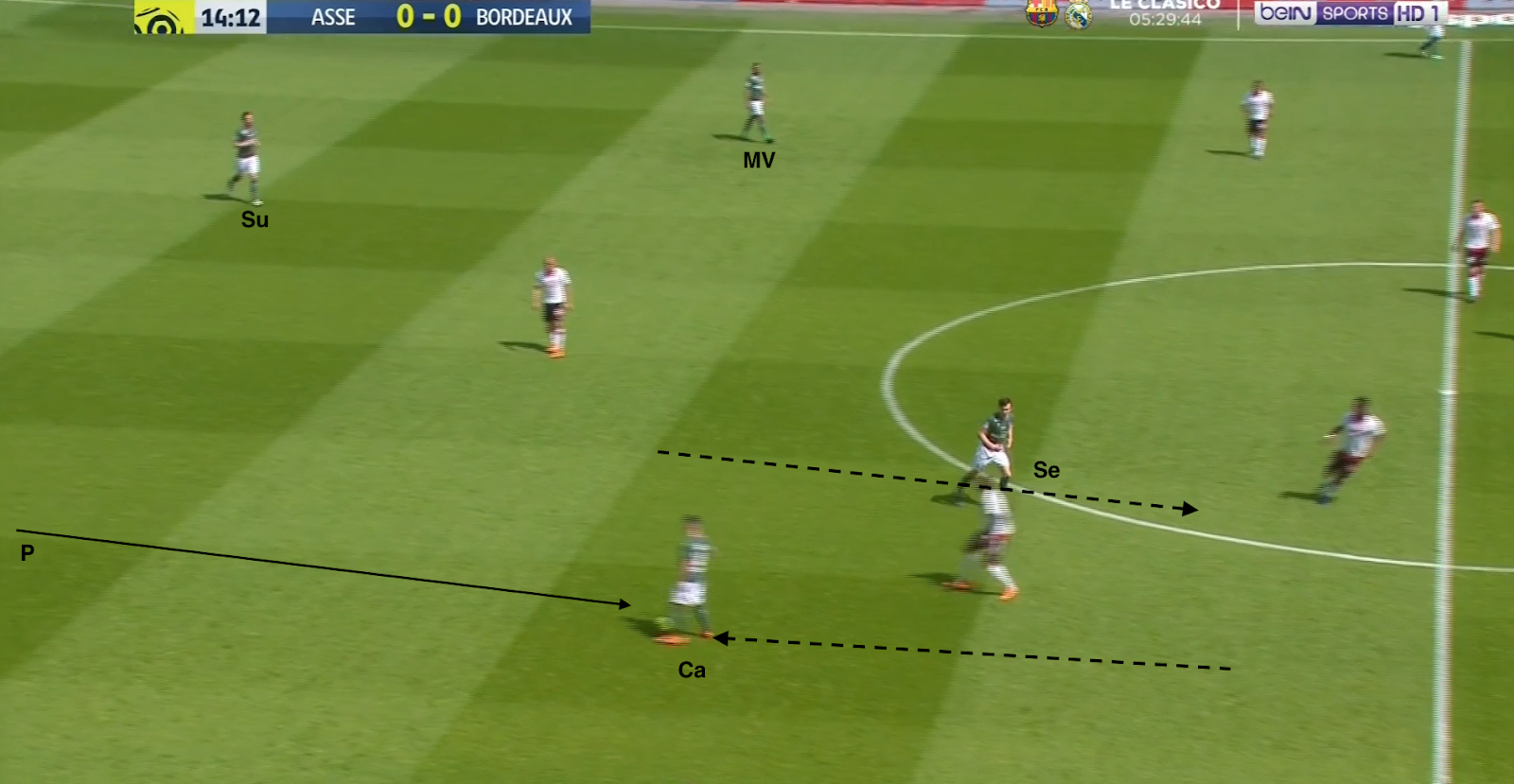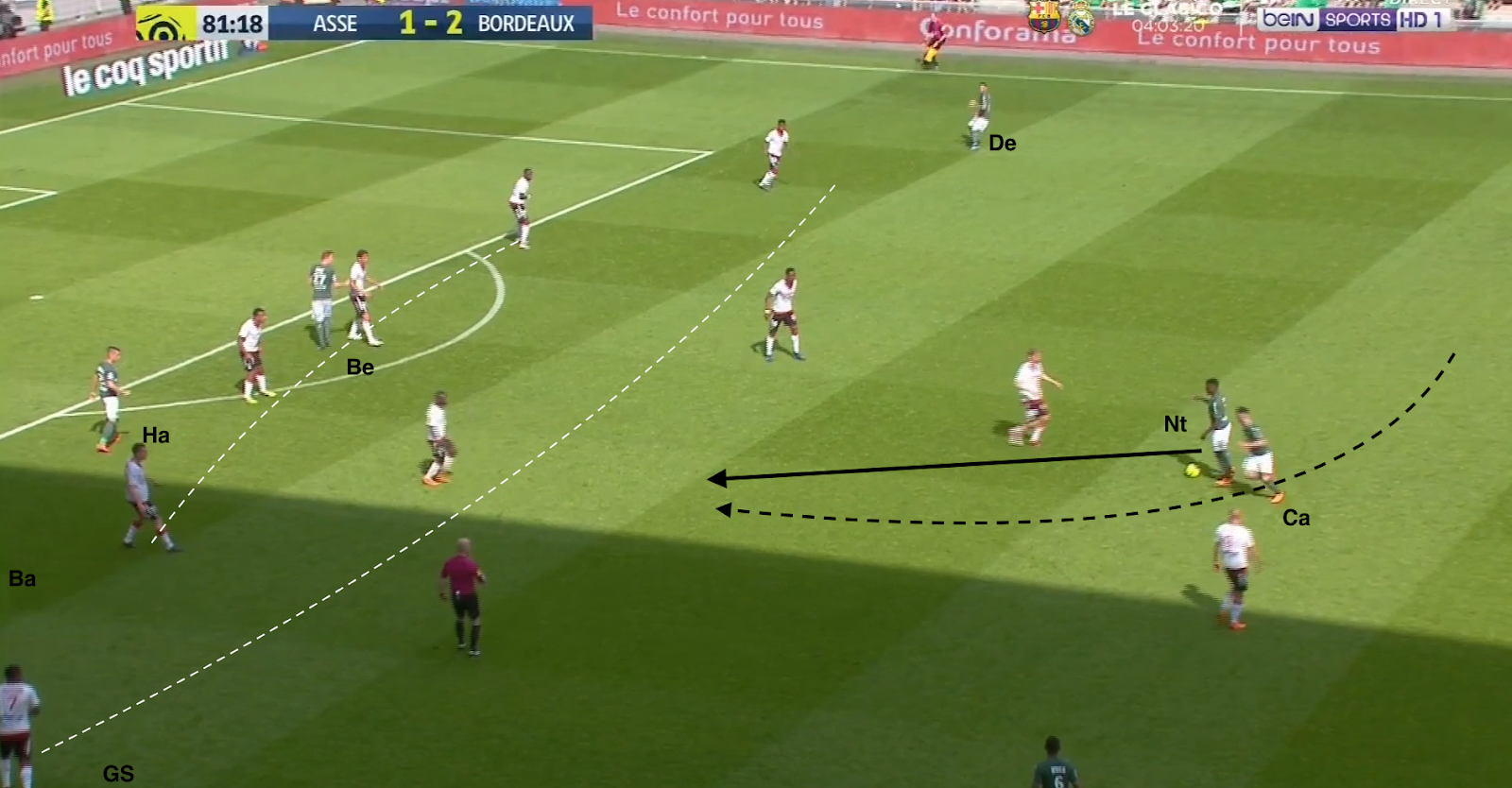 Perrin se trouve dans une position de meneur de jeu (et Cabella de défenseur central). L'adversaire qui se trouve à terre n'a pas d'influence sur cette action, il y a trois stéphanois autour de lui (M'Vila, Cabella et Subotic). Il y a des 2-contre-2 dans chaque couloir, Beric est entouré de 3 adversaires... il n'y a aucun décalage fait, sauf que l'appel de Bamba est parfaitement effectué dans l'espace libéré par le latéral adverse, tout comme la passe du capitaine, qui le trouve à l'entrée de la surface. Malheureusement sa frappe trouve le poteau...