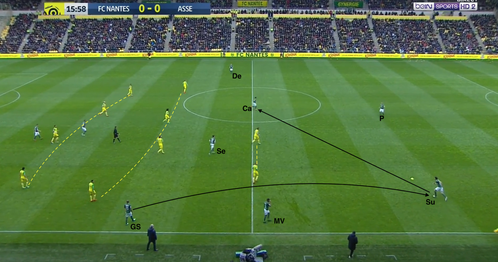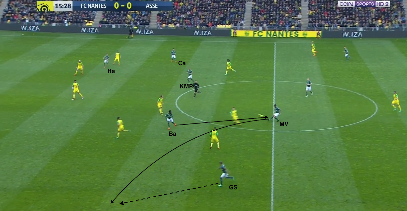 Ce n'était pas un contre proprement-dit, comme dans le premier exemple, mais les passes verticales et cette projection rapide vers l'avant permettent de vite traverser le bloc adverse et peuvent en donner l'impression. Ces passes verticales sont possibles grâce aux bons appels que les joueurs de l'ASSE ont fait dans tous les sens, comme ça devient évident lors d'un autre exemple, 10 minutes plus tôt :