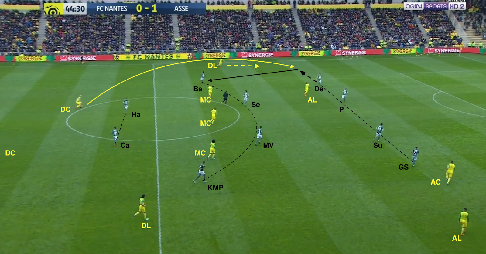 Si les 4 défenseurs sont alignés (mais très resserrés), 5 autres Nantais sont regroupés dans l'axe. Les couloirs sont donc complètement abandonnés, c'est là que le jeu est envoyé par Hamouma, dans la course de Gabriel Silva. Et ce n'est pas fini :