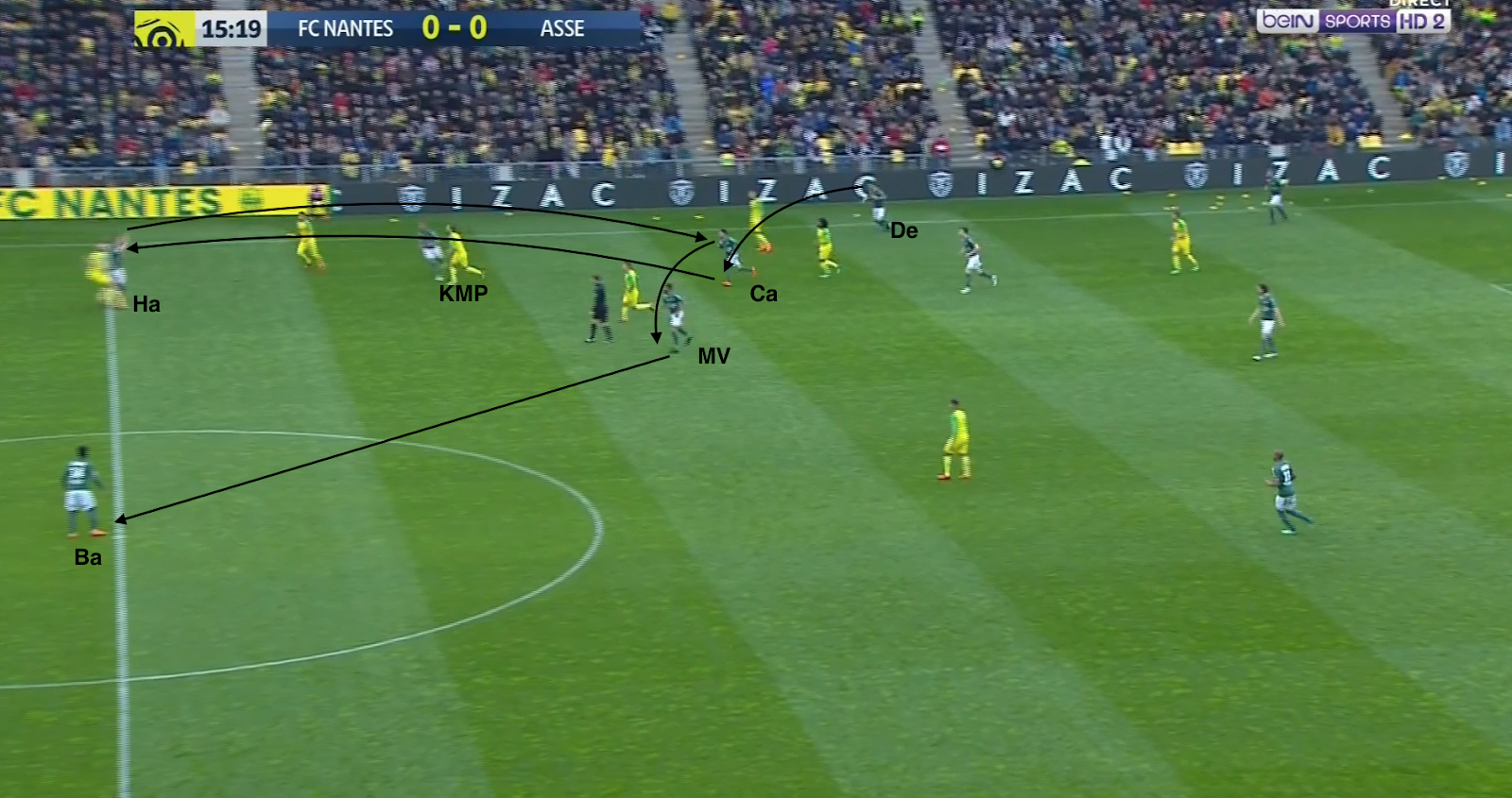 Hamouma s'excentre pour proposer une solution, Debuchy s'appuie dessus, Cabella y va aussi, il est servi par Hamouma, mais un Nantais commet une faute intelligente, qui casse l'attaque stéphanoise.