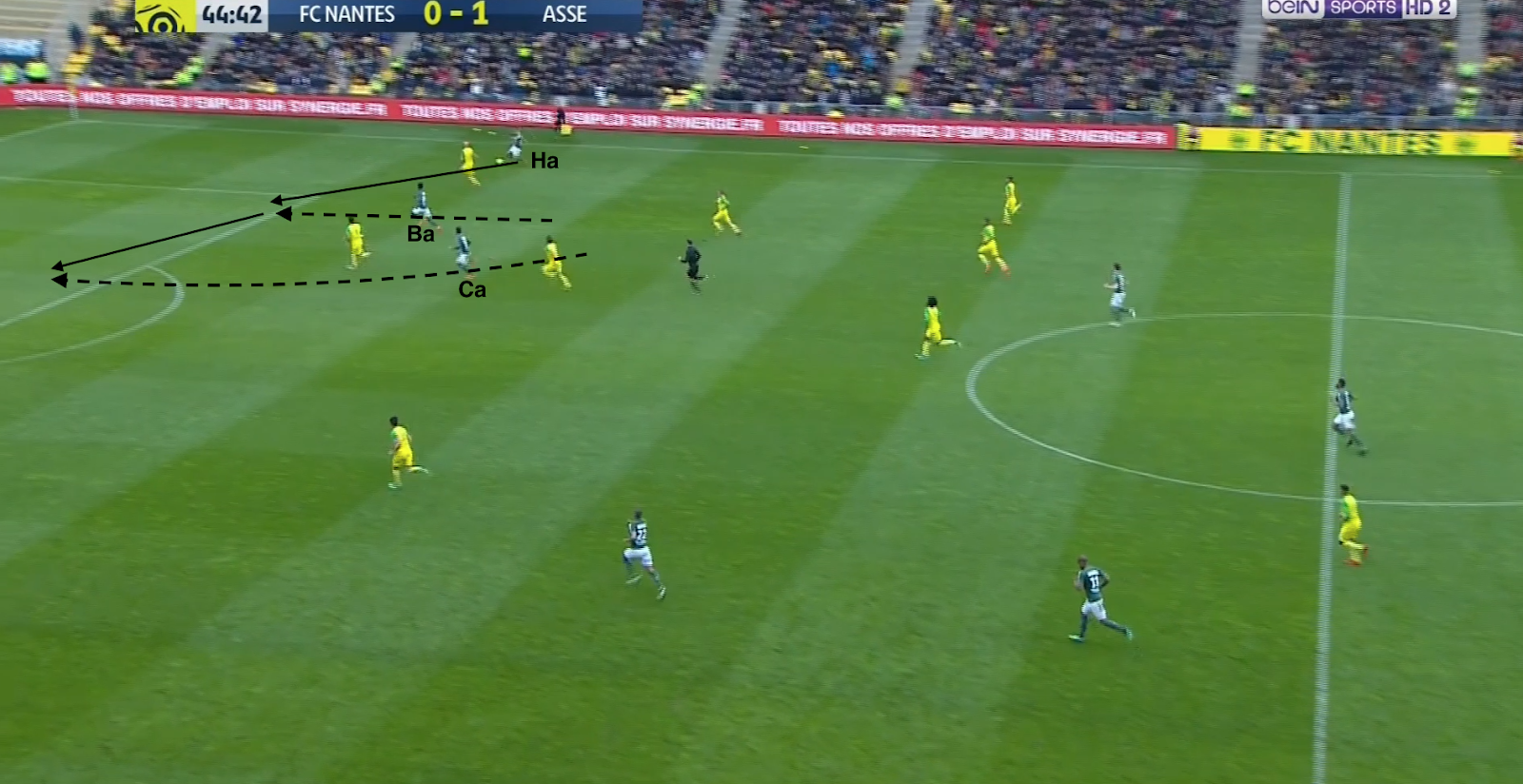 Si les 4 défenseurs sont alignés (mais très resserrés), 5 autres Nantais sont regroupés dans l'axe. Les couloirs sont donc complètement abandonnés, c'est là que le jeu est envoyé par Hamouma, dans la course de Gabriel Silva. Et ce n'est pas fini :