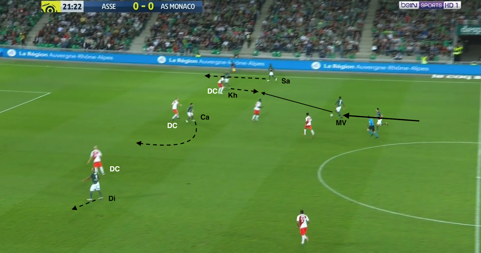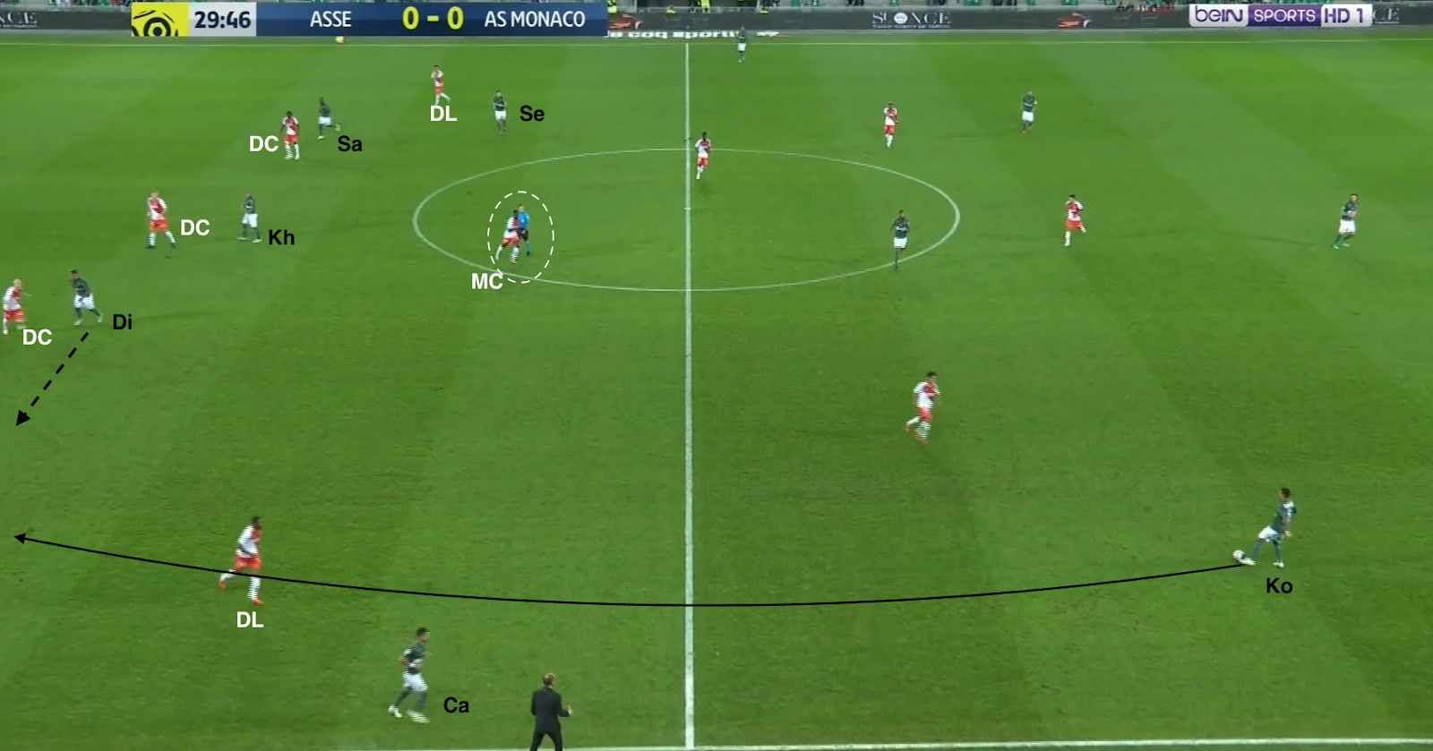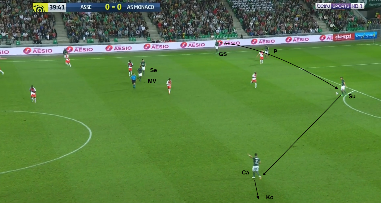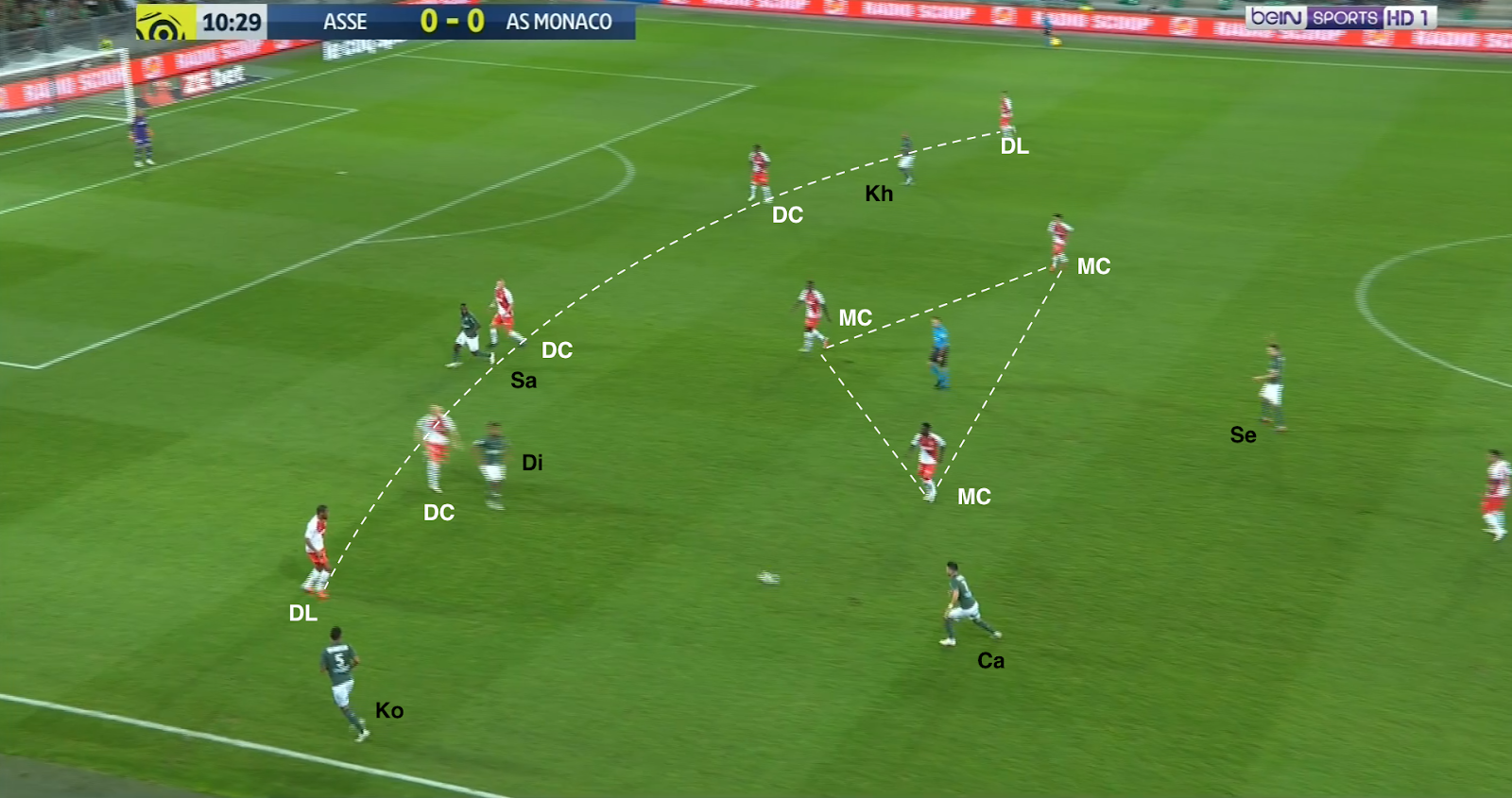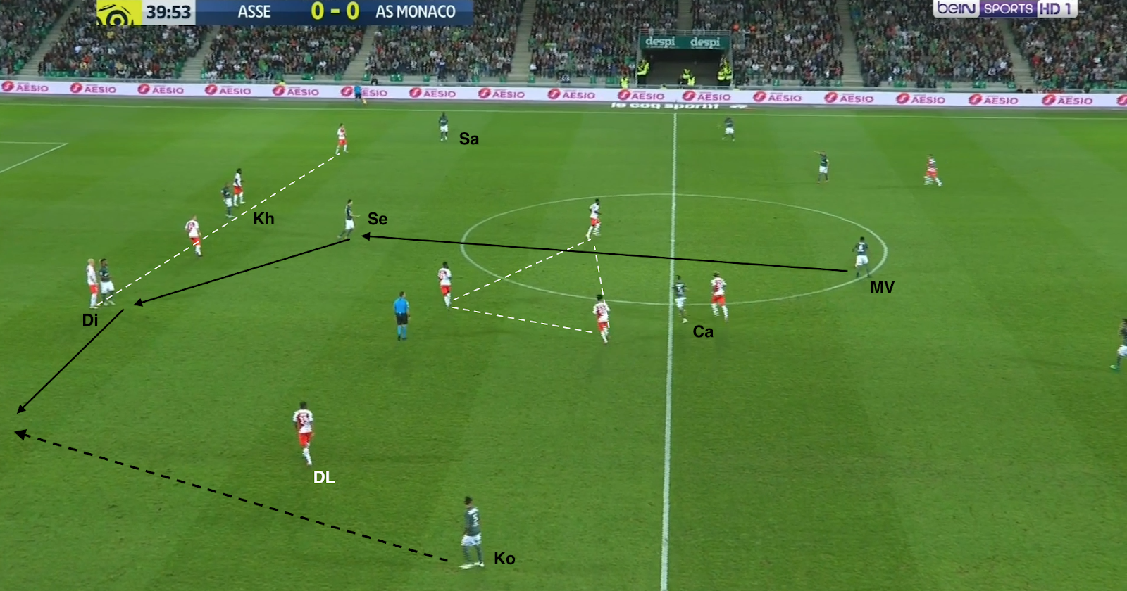 Un choix tactique qui semble judicieux, même si c'est une approche très défensive, Monaco ressemblant ainsi à une petite équipe qui essaye de bétonner et jouer les contres quand elle se déplace à Geoffroy-Guichard. Mais ce système a été facilement déjoué par l'ASSE, comme par exemple à la 30e minute :