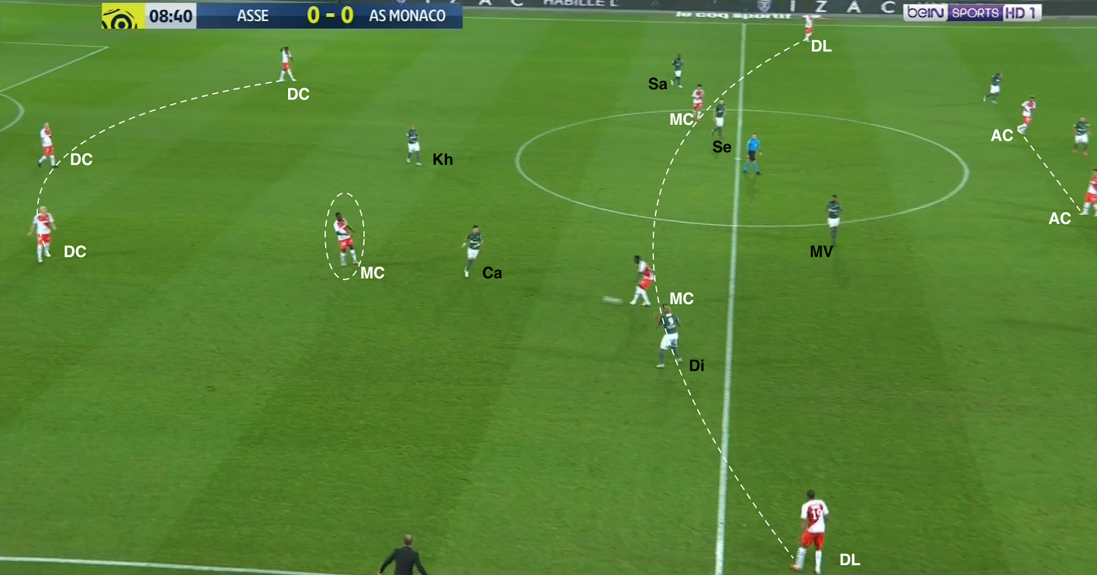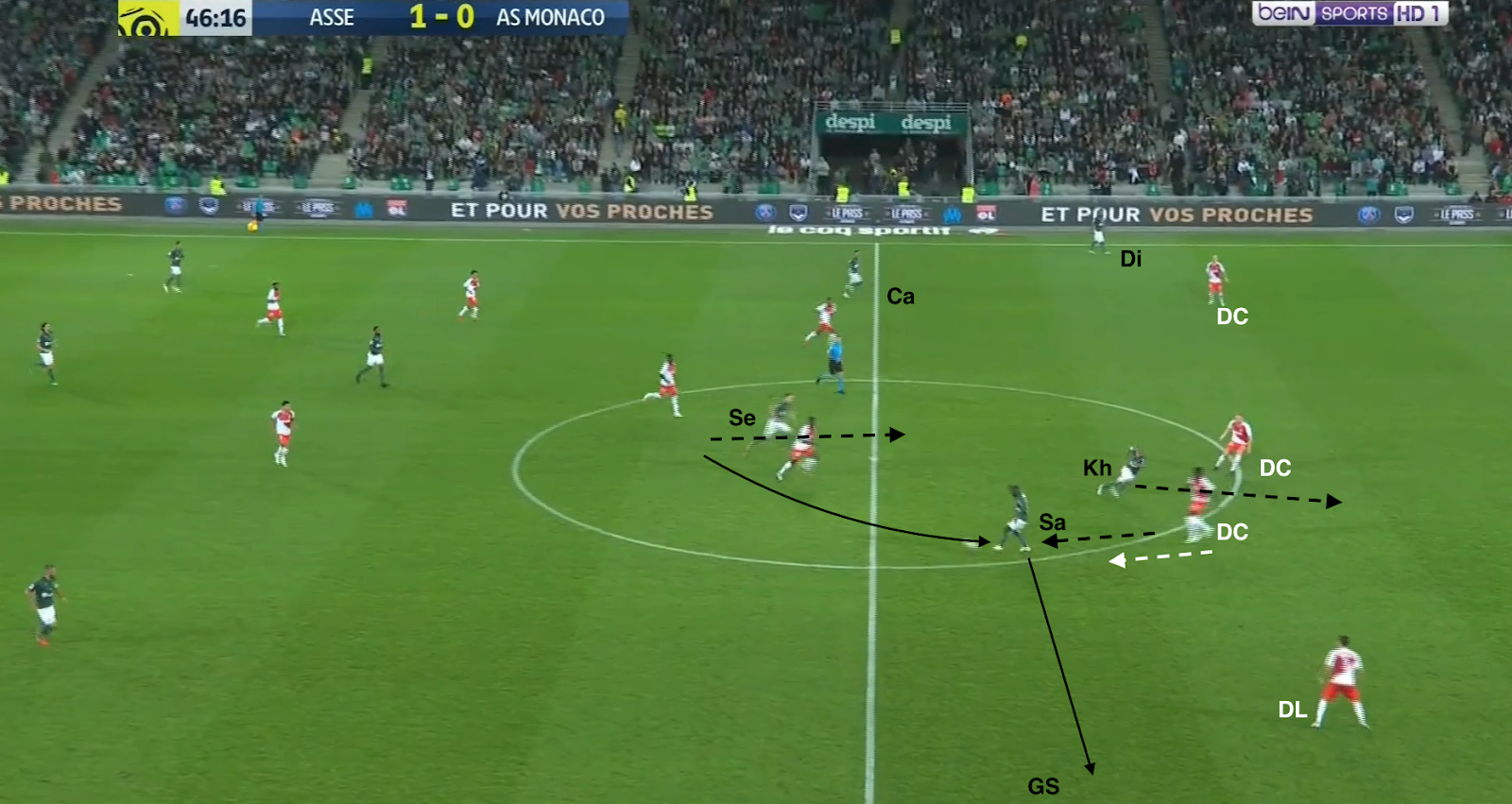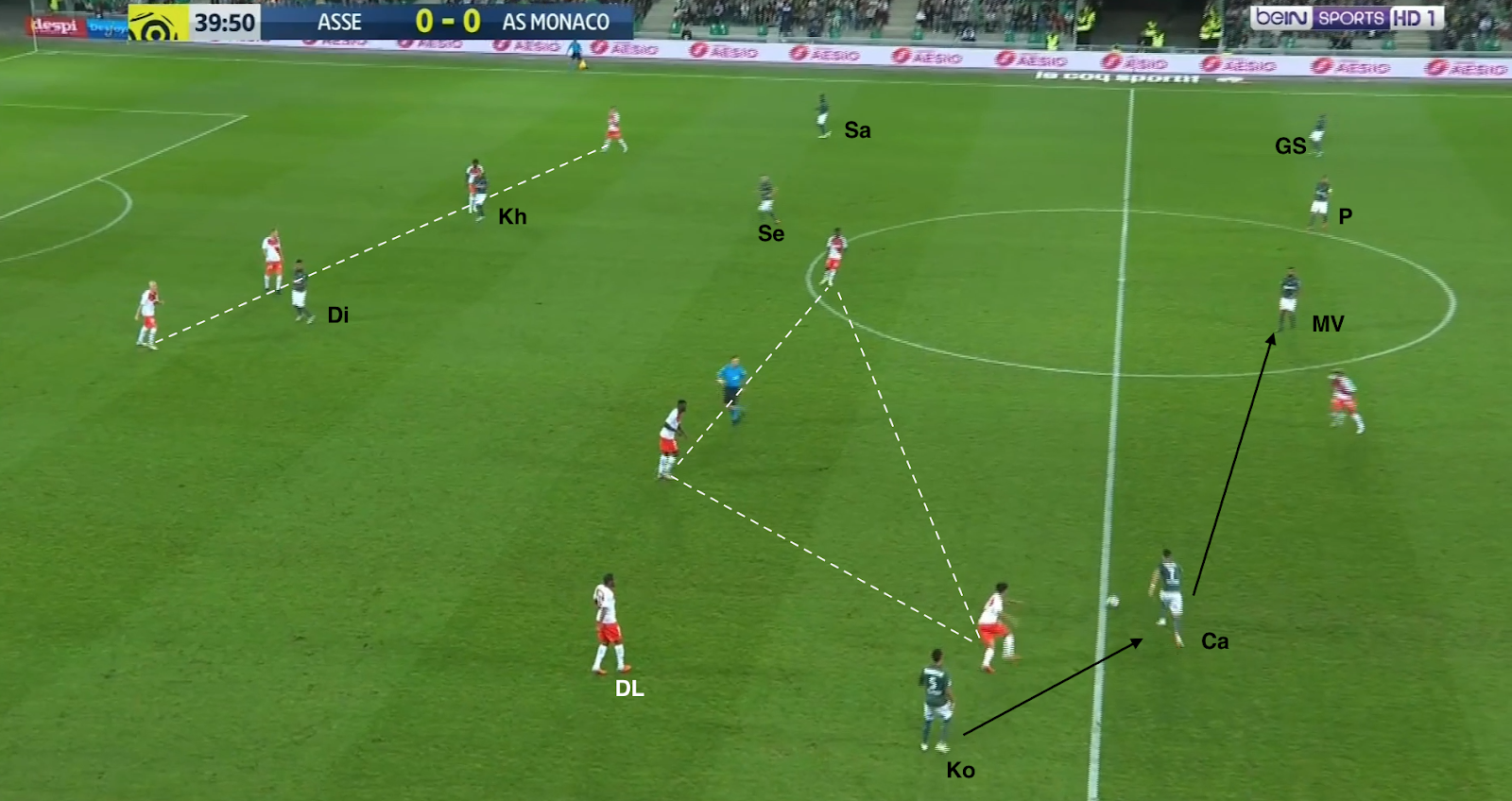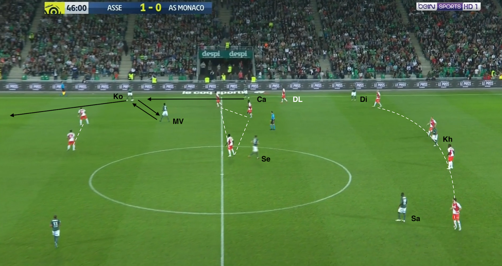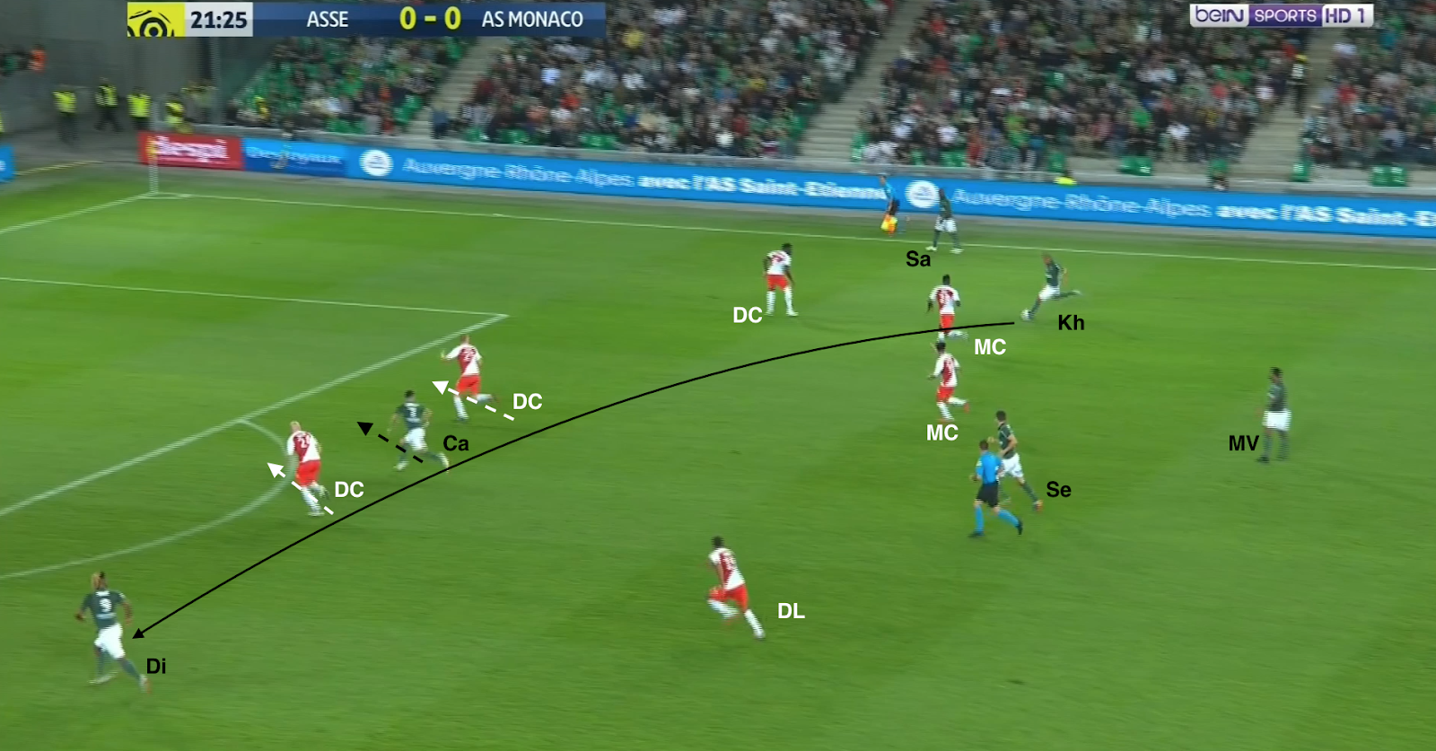 Un choix tactique qui semble judicieux, même si c'est une approche très défensive, Monaco ressemblant ainsi à une petite équipe qui essaye de bétonner et jouer les contres quand elle se déplace à Geoffroy-Guichard. Mais ce système a été facilement déjoué par l'ASSE, comme par exemple à la 30e minute :