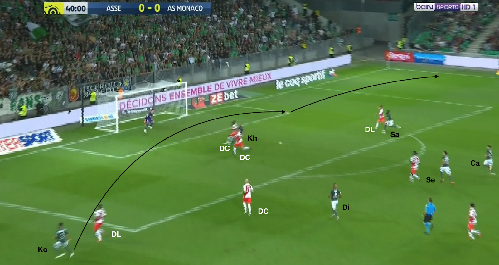 Et la défense est de nouveau en déséquilibre, la faute du même latéral droit, pas placé, mais aussi, de nouveau, du placement excentré de Cabella. Il est pris par le piston gauche de Monaco, mais comme Gabriel Silva est monté haut, il est doit être pris par un défenseur central, laissant ainsi les deux autres contre Salibur, Khazri et Diony. Comme ils ne sont pas aidés, ni par le piston droit, ni par les milieux, il y a un trou dans la défense et l'appel et la passe sont parfaits, pour l'ouverture du score.