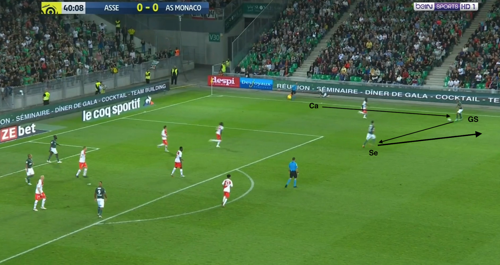 Bref, ça peut être une bonne idée de bloquer l'axe, mais si l'adversaire s'adapte en excentrant ses milieux, le déséquilibre peut être créé facilement. Surtout que Cabella était suivi par un latéral à chaque fois qu'il s'excentrait, comme on pourra le voir dans d'autres exemples. Mais avant cela, une autre facette du jeu stéphanois.