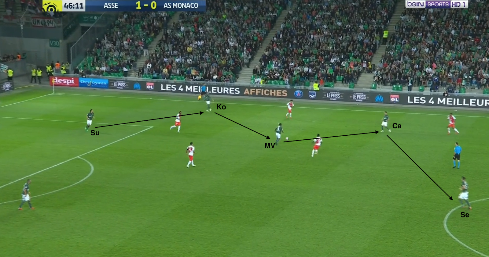 Diony fait un appel dans le dos du latéral monté suivre Cabella dans le couloir, il est trouvé par la passe de Kolo et la défense de Monaco se retrouve en difficulté. Le centre de l'attaquant stéphanois ne cherche ni Khazri, ni Salibur, mais Selnaes...