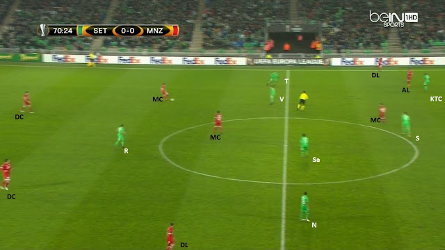 On recule, le milieu adverse commence à prendre le dessus. Et comme un 0-0 nous qualifie, à partir de la 60ème, Galtier décide de verrouiller et passe dans le 4-1-4-1 standard, avec Selnaes en sentinelle, Veretout et Saivet devant lui. On est une équipe très solide dans ce système et le score est maintenu vierge, l'objectif est atteint.