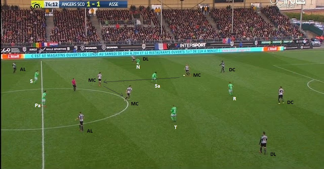 Quatre jours plus tard, les Verts commencent le match en 4-2-3-1 avec Saivet en soutien de Roux. On ne tient pas le ballon, on est en dessous physiquement et on concède l'ouverture du score et plein d'autres occasions - une des raisons est aussi que la ligne de deux axiaux Dabo-Pajot est trop loin de la ligne des défenseurs, les adversaires se placent intelligemment dans cet espace. Comme on est menés, Galtier ne se permet pas d'enlever un élément offensif pour colmater cet espace en plaçant une sentinelle.