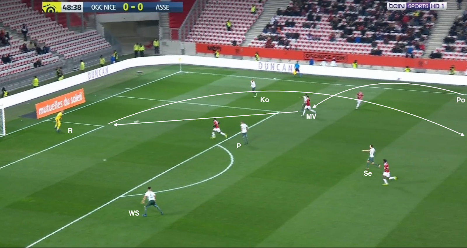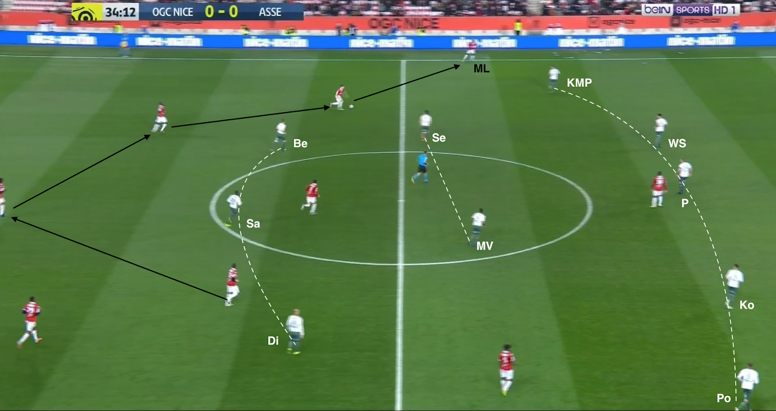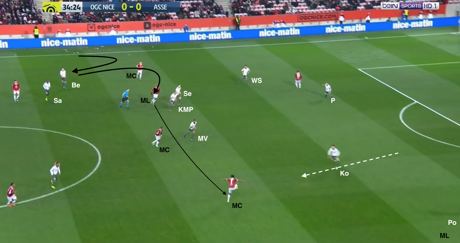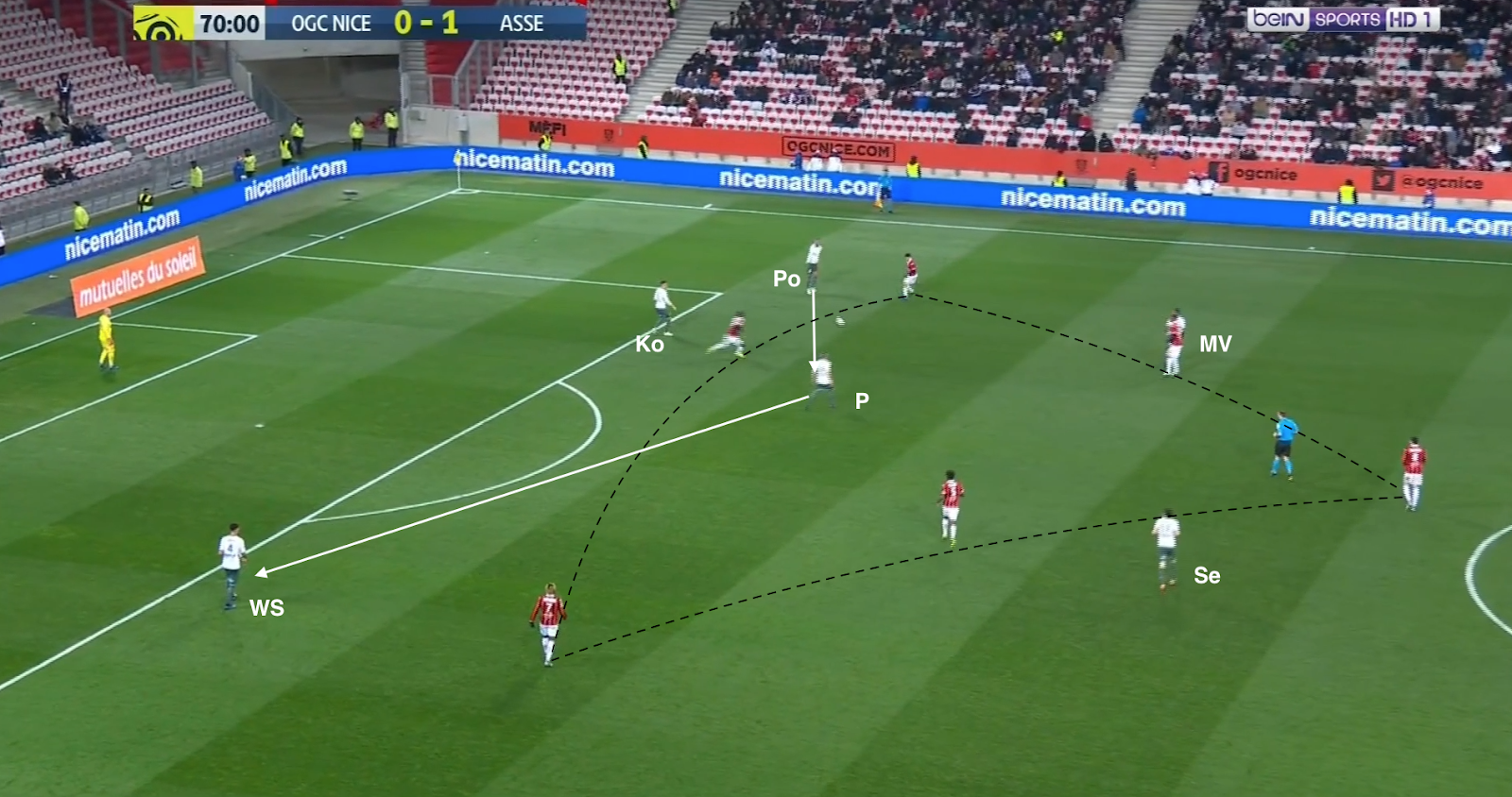 12 secondes plus tard, après avoir échoué à éliminer KMP et Selnaes, il lâche enfin le ballon, en écartant vers la droite. Comme aucun des trois offensifs stéphanois ne fait l'effort de défendre, on trouve 4 Niçois sur la même ligne contre seulement 3 Stéphanois (Selnaes - KMP - M'Vila). Et comme Polomat est occupé avec son adversaire direct dans le couloir, Kolo doit sortir de la défense. A partir de ce moment, c'est un duel à 3-contre-3 dans cette zone du terrain :