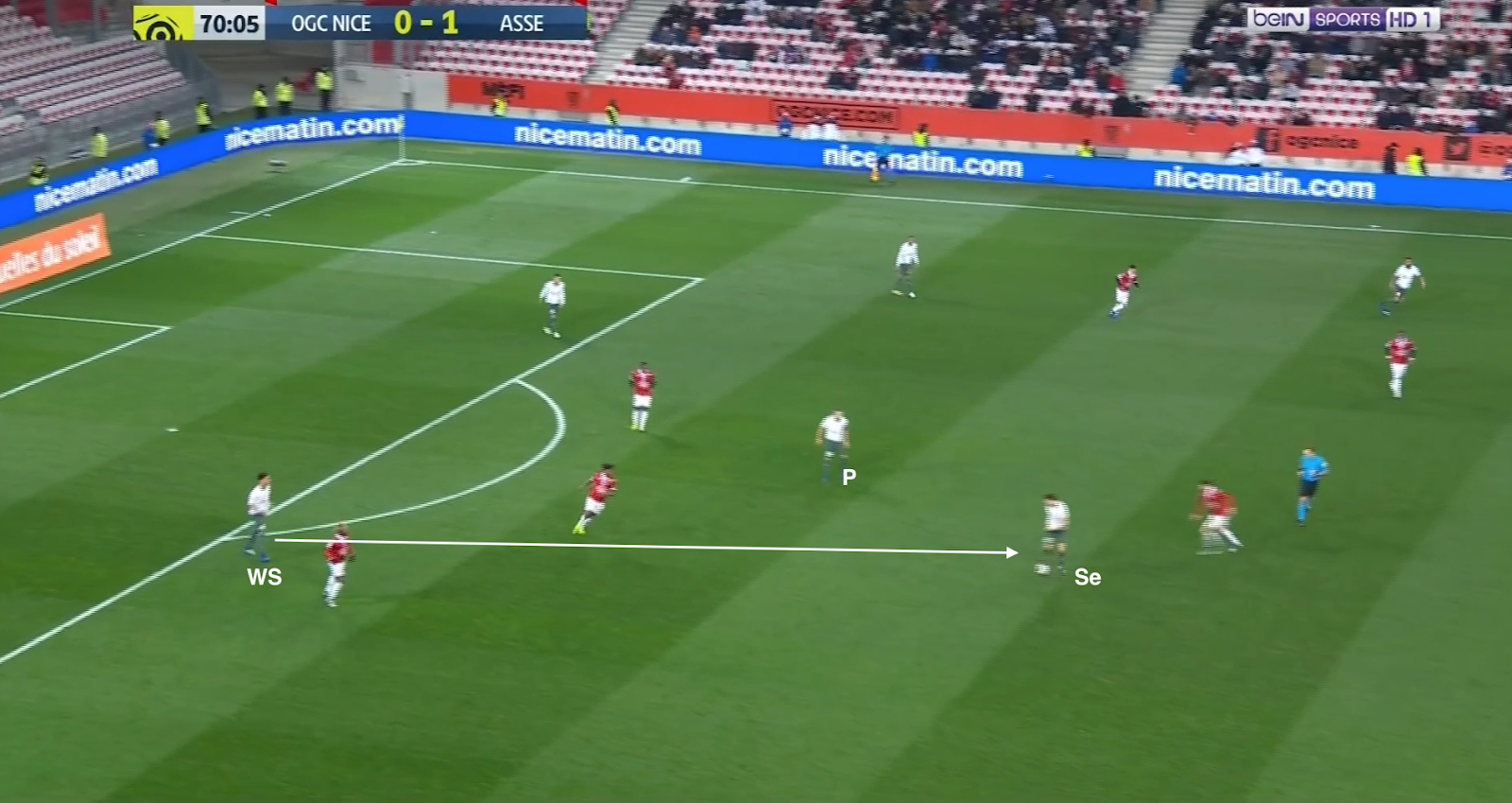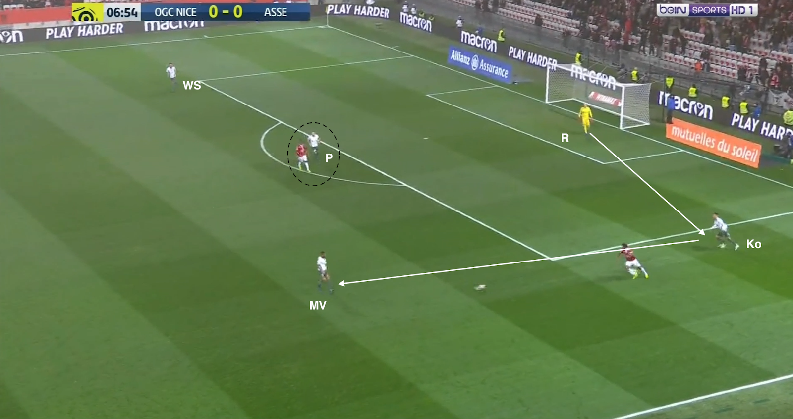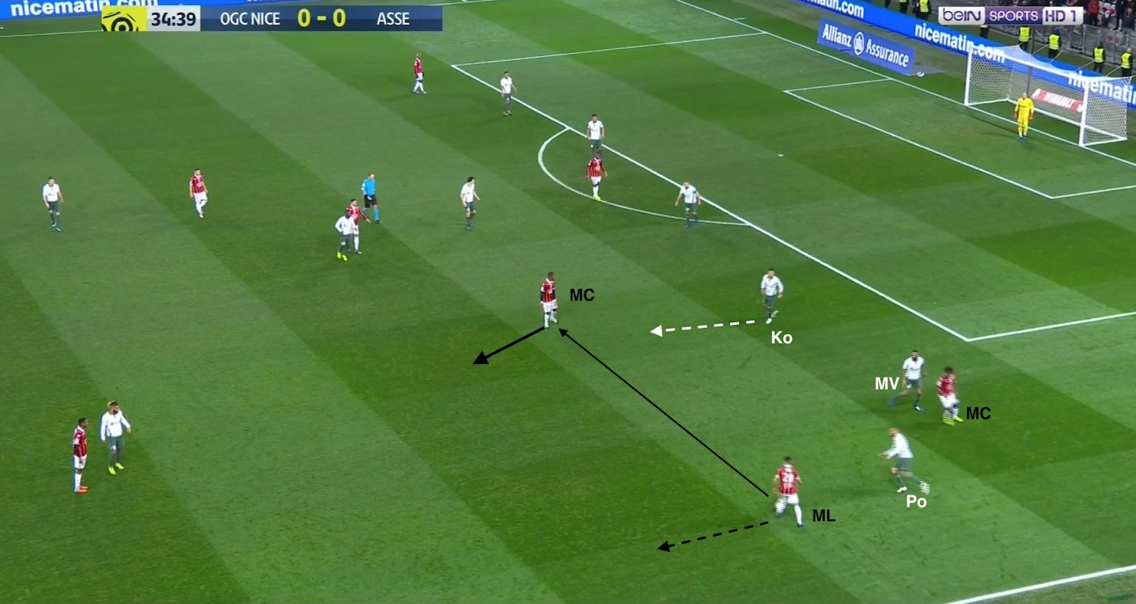 12 secondes plus tard, après avoir échoué à éliminer KMP et Selnaes, il lâche enfin le ballon, en écartant vers la droite. Comme aucun des trois offensifs stéphanois ne fait l'effort de défendre, on trouve 4 Niçois sur la même ligne contre seulement 3 Stéphanois (Selnaes - KMP - M'Vila). Et comme Polomat est occupé avec son adversaire direct dans le couloir, Kolo doit sortir de la défense. A partir de ce moment, c'est un duel à 3-contre-3 dans cette zone du terrain :