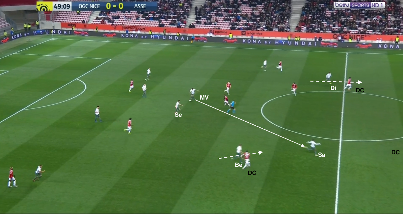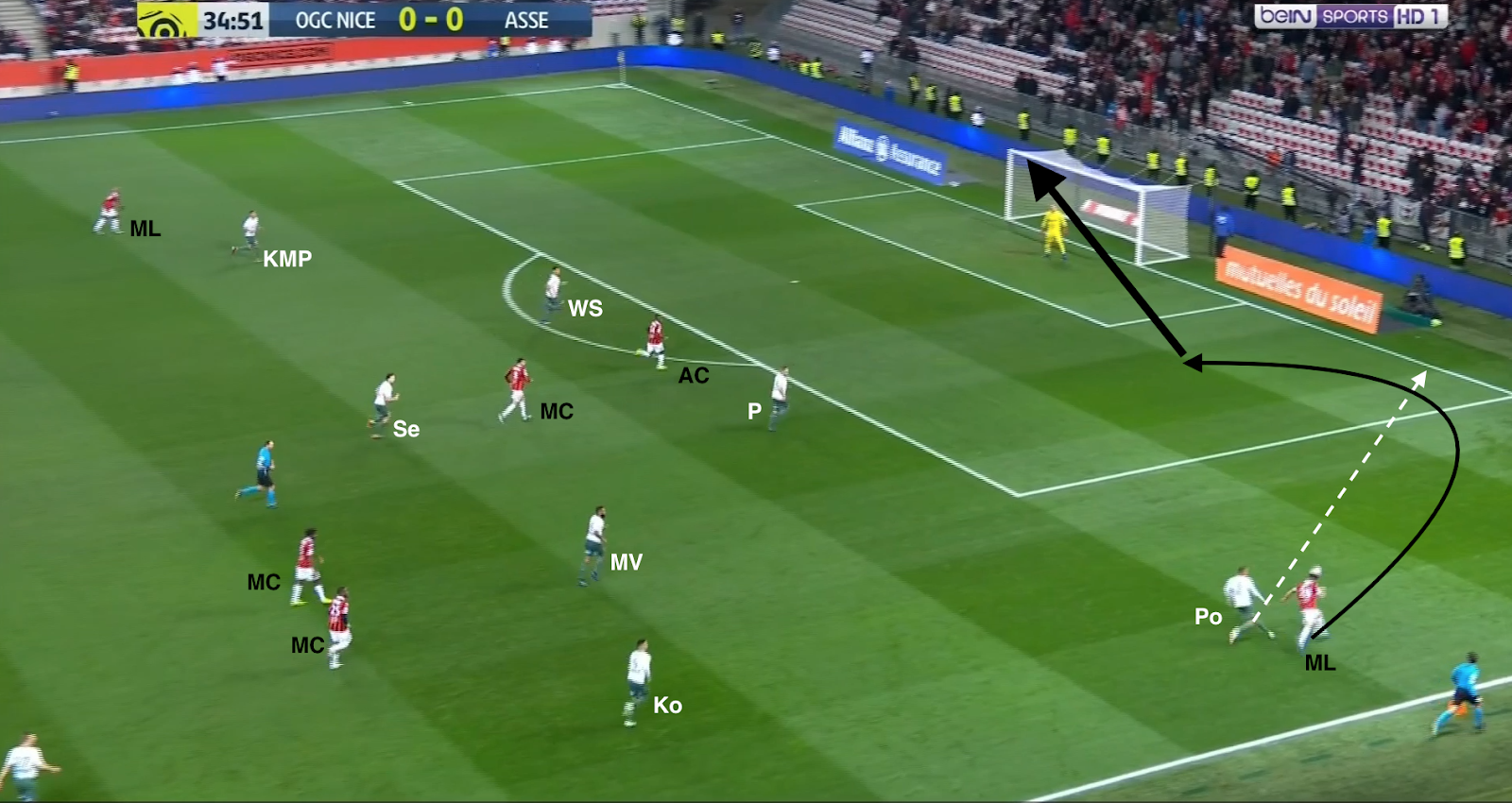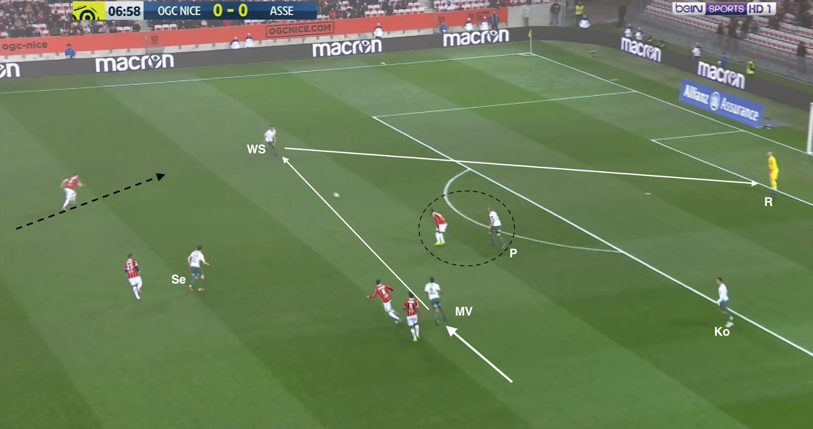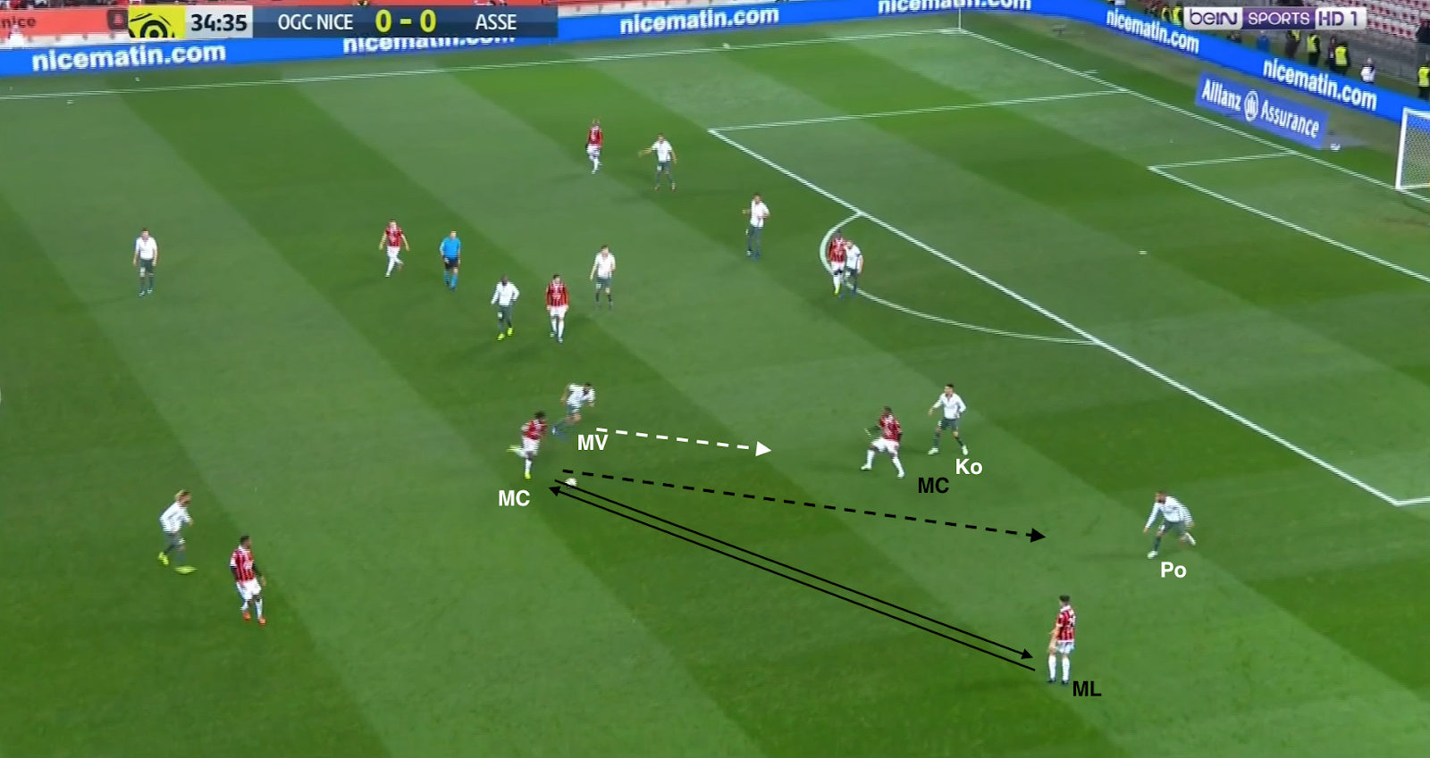 12 secondes plus tard, après avoir échoué à éliminer KMP et Selnaes, il lâche enfin le ballon, en écartant vers la droite. Comme aucun des trois offensifs stéphanois ne fait l'effort de défendre, on trouve 4 Niçois sur la même ligne contre seulement 3 Stéphanois (Selnaes - KMP - M'Vila). Et comme Polomat est occupé avec son adversaire direct dans le couloir, Kolo doit sortir de la défense. A partir de ce moment, c'est un duel à 3-contre-3 dans cette zone du terrain :