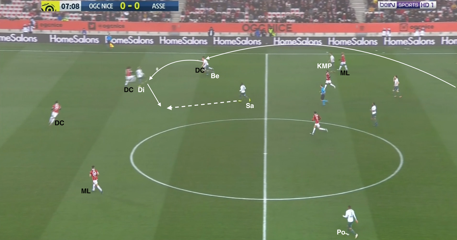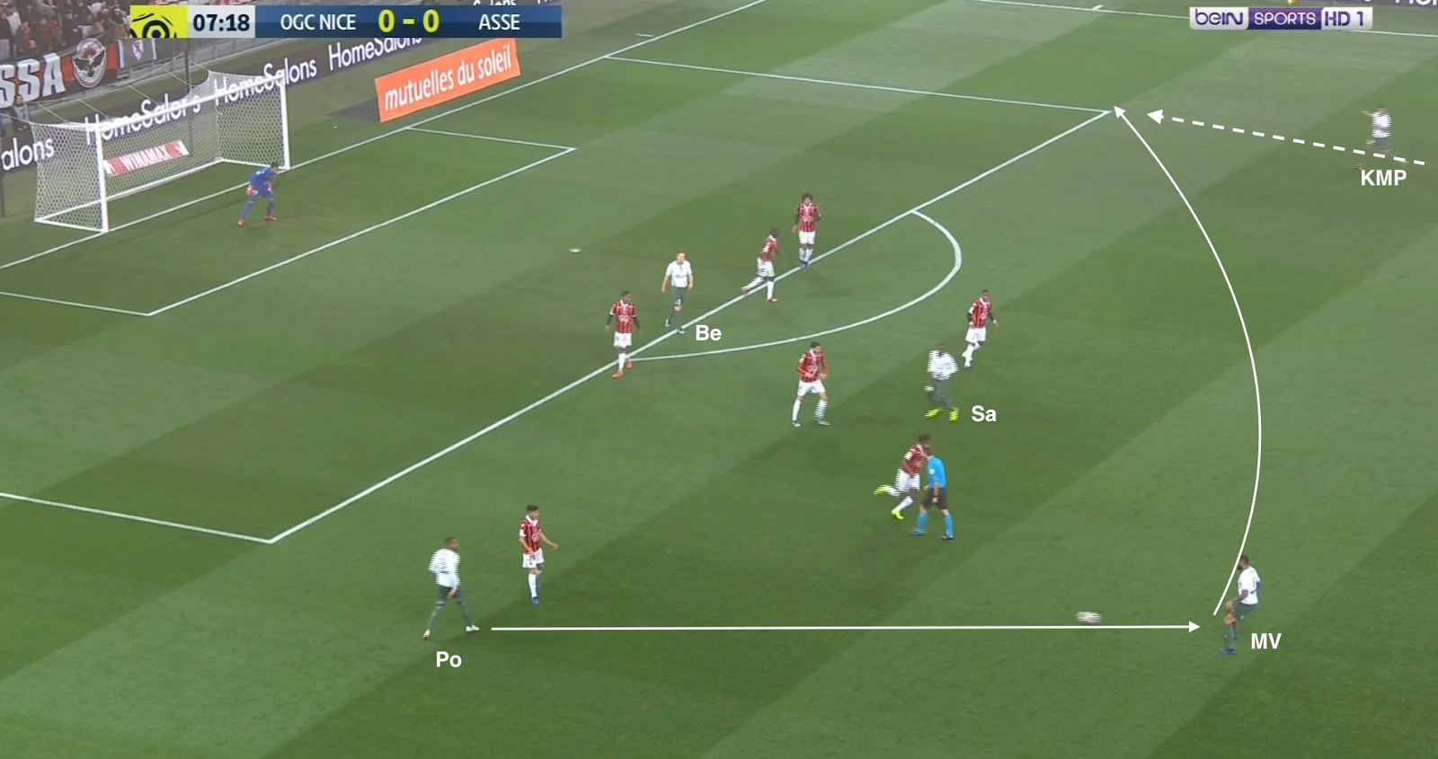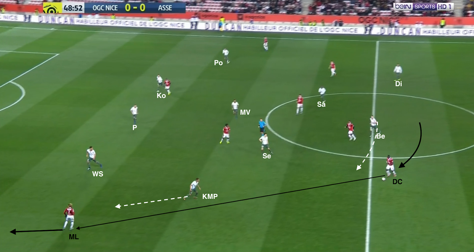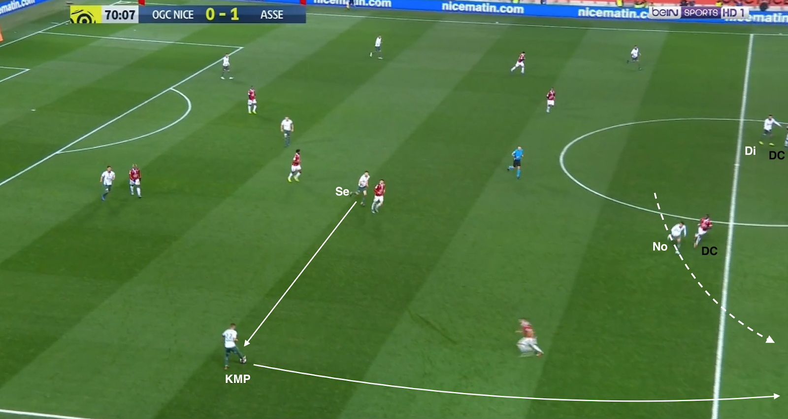 ... qui écarte à droite et le pressing est déjoué ! Mieux que ça, Diony et Nordin se trouvent contre seulement deux défenseurs. L'appel du dernier et parfaitement lu par KMP, qui le lance en profondeur. Malheureusement le défenseur niçois commet une faute et l'attaque construite (pas un contre !) des Verts est arrêtée avant qu'elle se transforme en occasion.