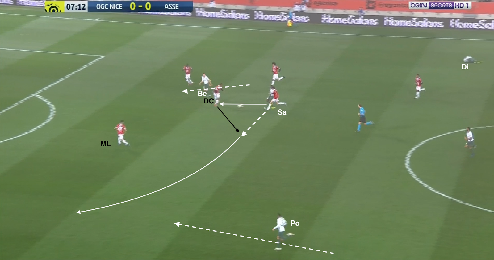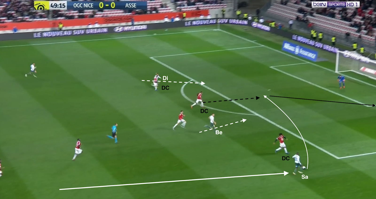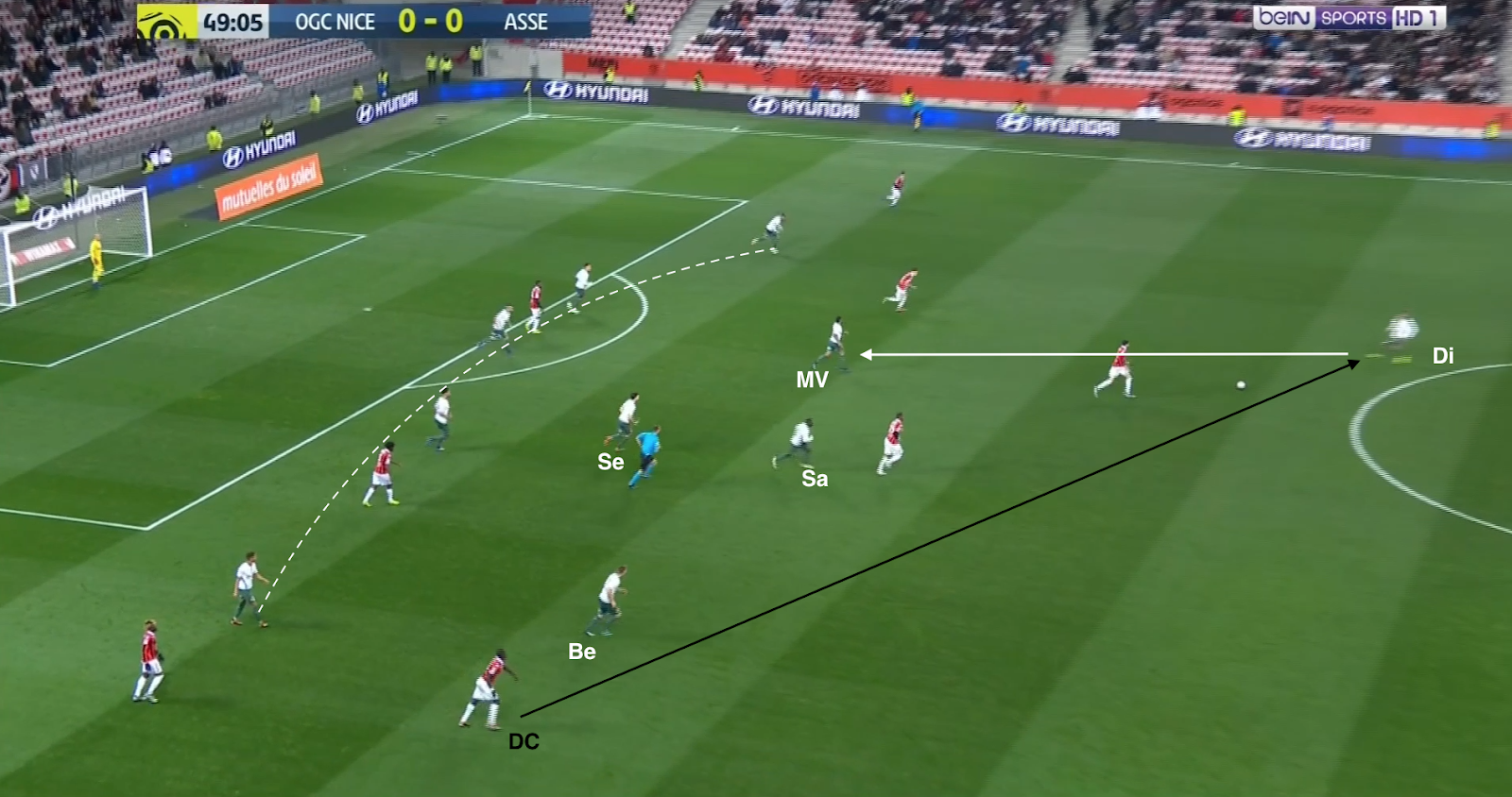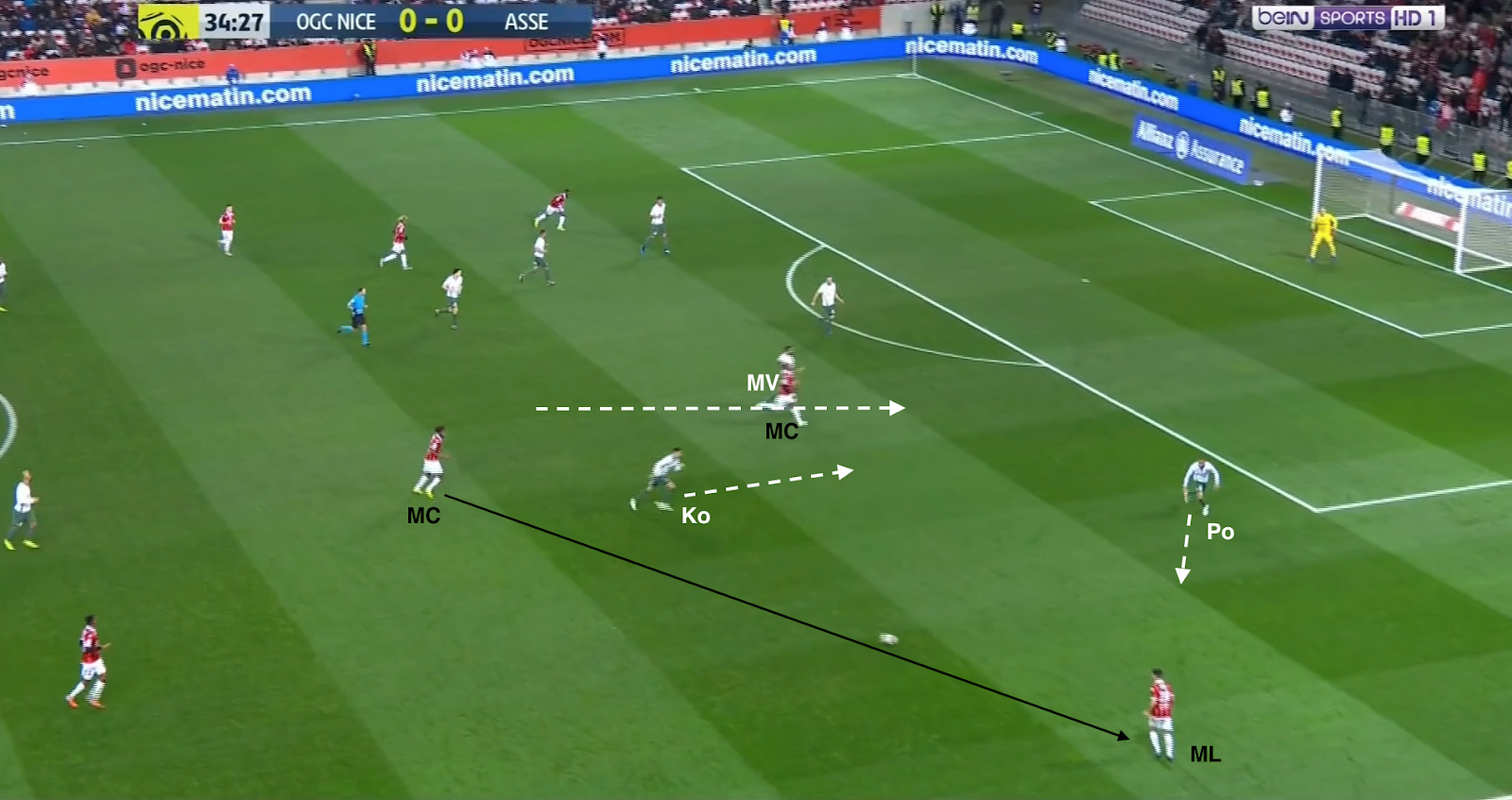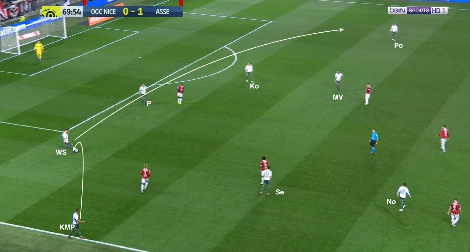 ... qui écarte à droite et le pressing est déjoué ! Mieux que ça, Diony et Nordin se trouvent contre seulement deux défenseurs. L'appel du dernier et parfaitement lu par KMP, qui le lance en profondeur. Malheureusement le défenseur niçois commet une faute et l'attaque construite (pas un contre !) des Verts est arrêtée avant qu'elle se transforme en occasion.
