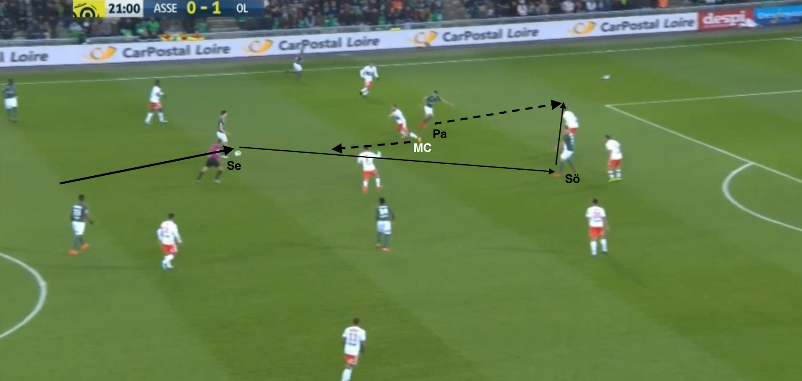 ... mais pas pour longtemps, maintenant c'est Maïga qui intercepte la passe. Il écarte pour RPG, qui cherche Bamba entre les lignes, mais à cause d'un mauvais contrôle, le ballon est perdu de nouveau... jusqu'au dégagement adverse intercepté par KTC. On arrête ici le suivi de cette action, après avoir suivi plus de deux minutes de possession stéphanoise dans la moitié adverse. Un jeu caractérisé par sa verticalité et un grosse présence pour récupérer le ballon dès qu'il est perdu - perte de balle qui arrive souvent quand on essaye ce genre de passes.