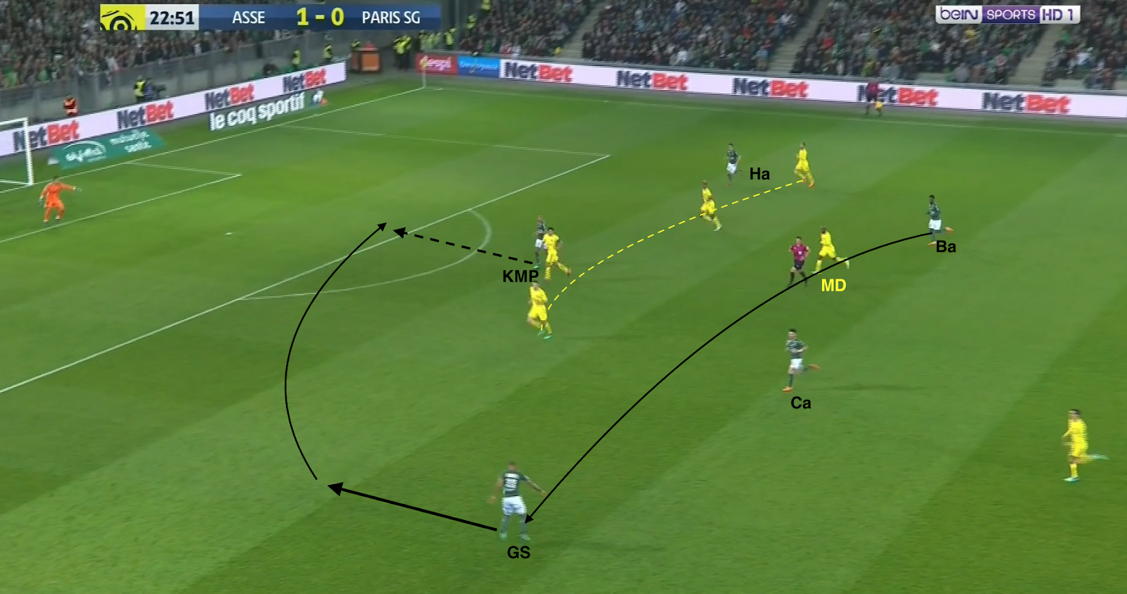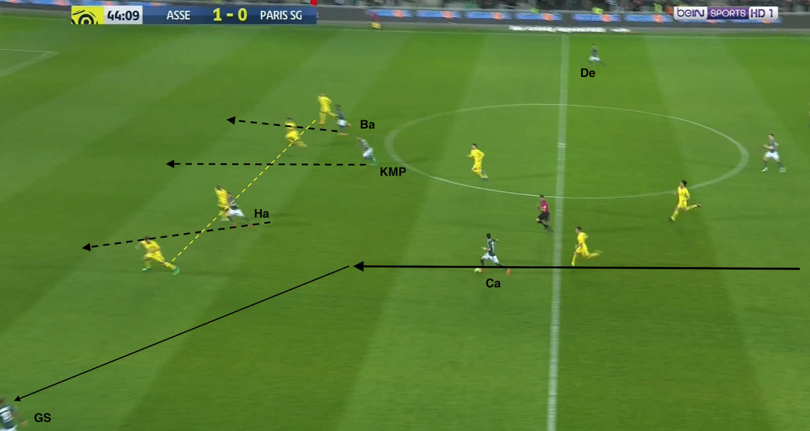 Les 5 Parisiens (tous sauf les 4 défenseurs) essayent d'enfermer les Stéphanois, pendant que M'Vila, complètement seul sur son côté gauche, fait des grands gestes pour demander le ballon. Il le reçoit via Selnaes, servi par Ruffier malgré le pressing adverse, et le donne ensuite à Cabella. Les Verts ont un grand espace à leur disposition et ils en profitent :
