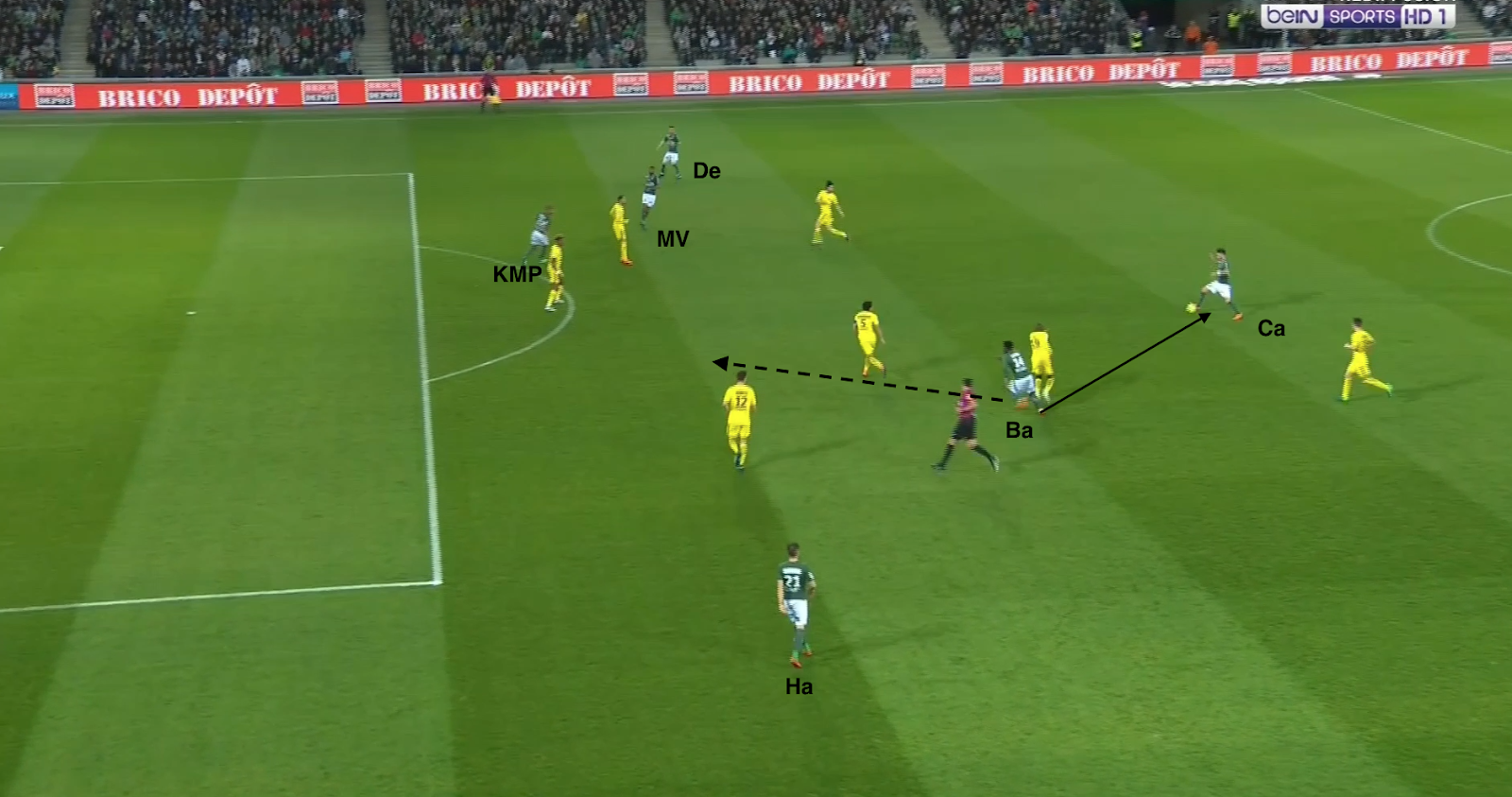 Les deux exemples précédents montrent comment les Verts se sont défaits du pressing haut adverse pour se retrouver ensuite en position de supériorité tactique dans la moitié adverse (balle au pied, face au jeu, contre une défense qui recule). Mais le plus bel exemple dans ce genre intervient quelques minutes plus tôt :