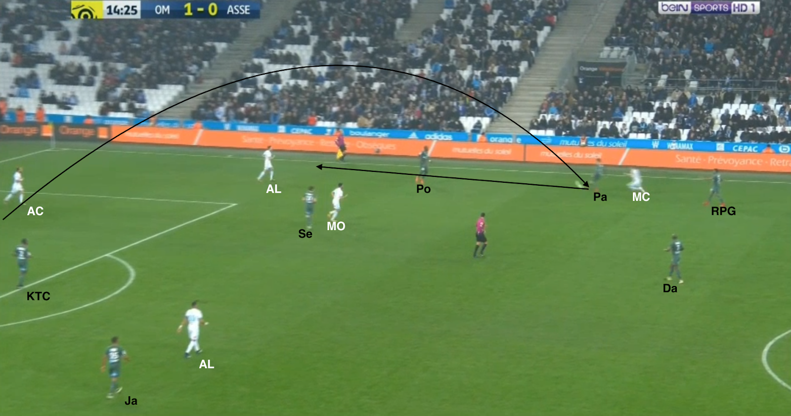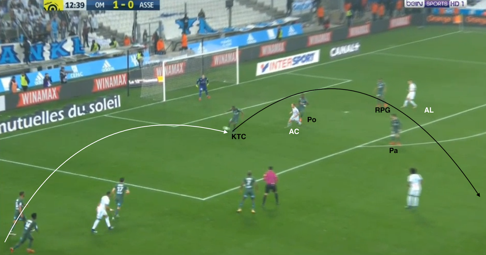 Heureusement, Pogba est le premier sur le ballon et il joue en retrait avec Ruffier - les quatre offensifs marseillais avaient suivi, mais pas les Verts - il y avait seulement les trois défenseurs qui ne faisaient pas de pressing. D'ailleurs, on ne voit que Selnaes et RPG en train de revenir. Ruffier joue long et trouve Pajot...
