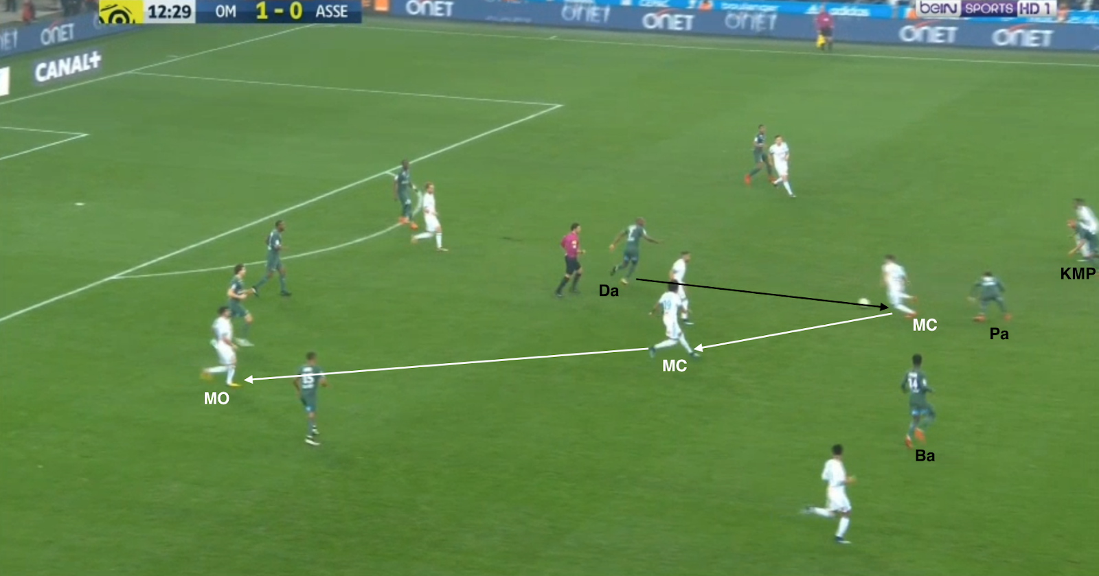 Les deux systèmes de jeu (4-1-4-1 vs 4-2-3-1) sont très explicites sur cette image - on peut aussi voir Dabo bien replié, sans faire de marquage individuel comme avant, et Diony qui ne peut pas couper les circuits de passe. Et l'attaque que l'OM a préparé tranquillement dans sa moitié est enfin déclenchée :