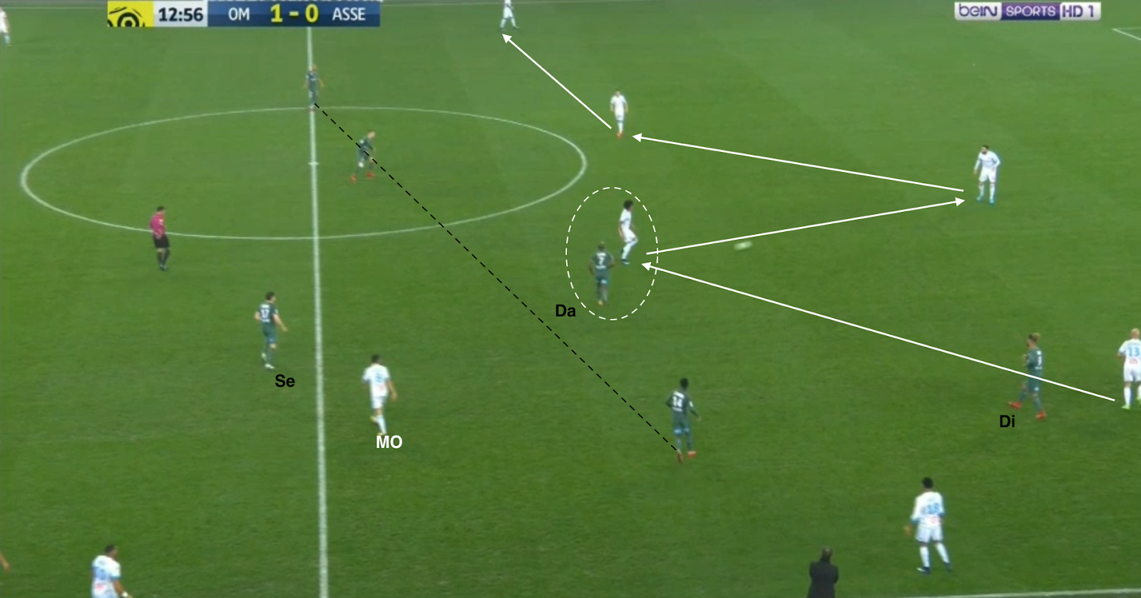 De la gauche vers la droite et de nouveau vers la gauche, la possession est marseillaise, mais aucun décalage n'est fait, le bloc des Verts coulisse bien. Diony ne court pas, il se replace presque en marchant - son pressing manque clairement de conviction. De toute façon, tout seul il ne peut pas faire grande chose. Sauf qu'en coulissant d'un côté à l'autre, la ligne des milieux de l'ASSE recule :