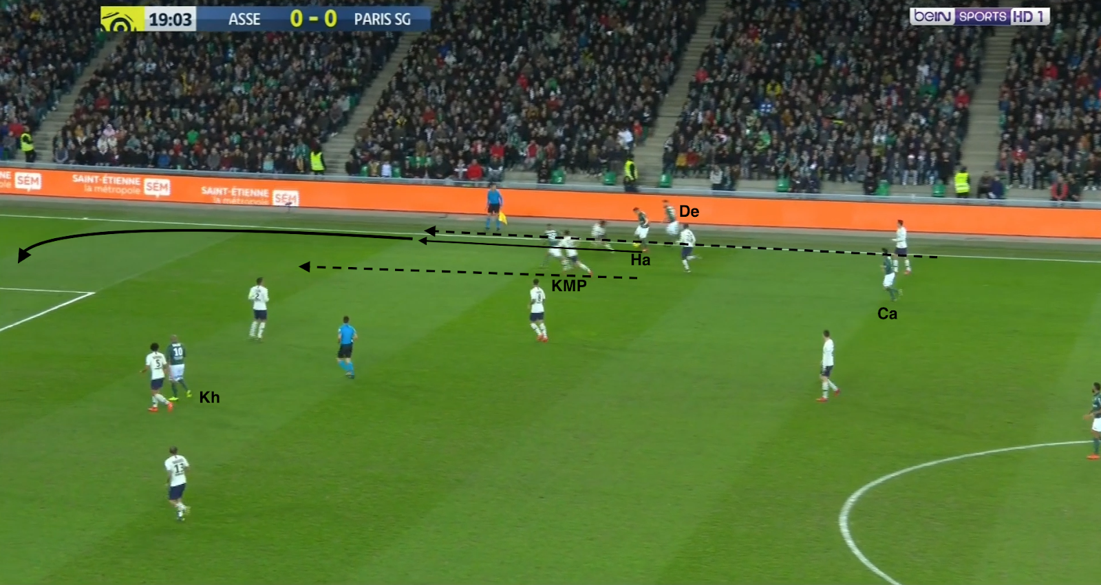 Les deux équipes ont démarré le match avec des défenses à 3, au 3-4-1-2 désormais habituel du côté de l'ASSE, le PSG ayant répondu avec un 3-5-2. Les systèmes étant symétriques et se neutralisant, la différence est faite par l'animation et l'approche tactique. Par exemple, une équipe peut choisir d'être en supériorité dans un couloir et de construire ses attaques à partir de là, pendant qu'une autre peut décider de subir et jouer vite les contres. Comme dans cette action qui commence à la 19e avec une relance de Ruffier pour Debuchy :