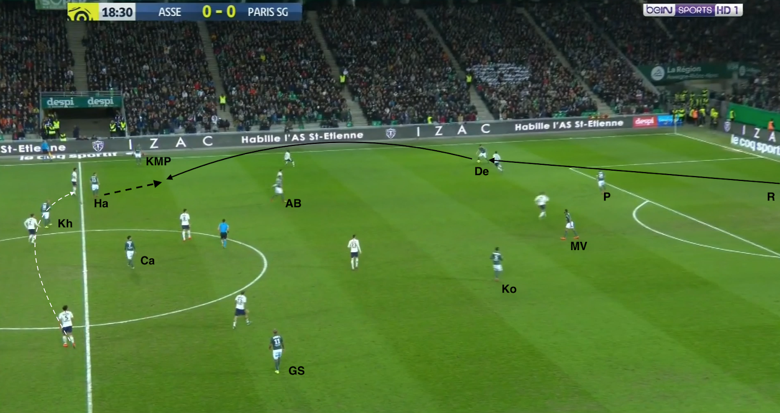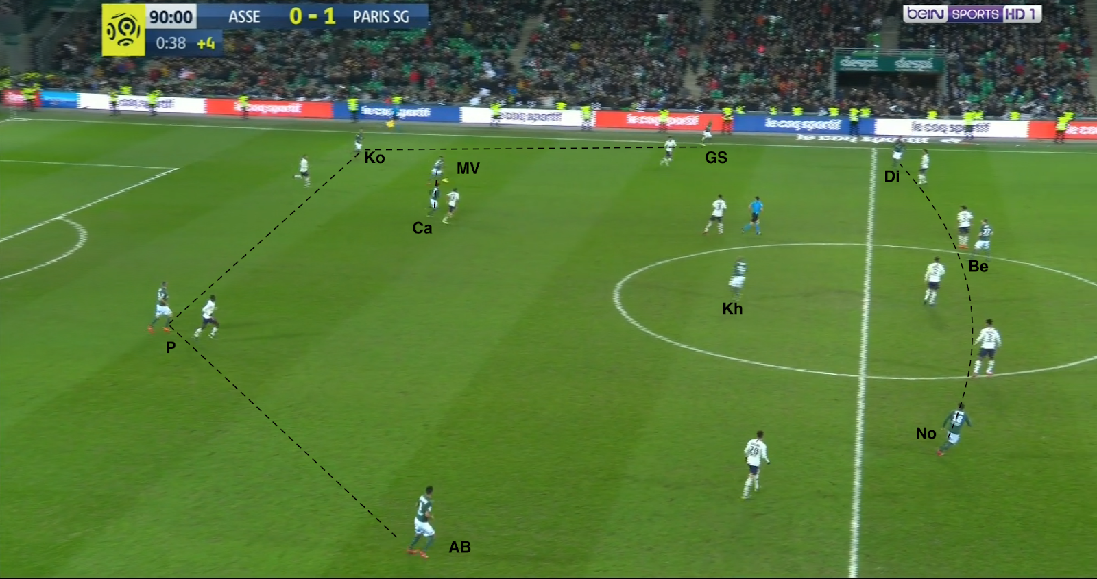 ... et on aperçoit une équipe du PSG coupée en deux. Quatre font un toro avec Khazri dans le rond central, cinq sont pris par les cinq défenseurs de l'ASSE et celui qui devrait relayer le ballon entre eux est pris entre les milieux stéphanois. Les défenseurs parisiens décident d'amener du surnombre en montant plus haut :