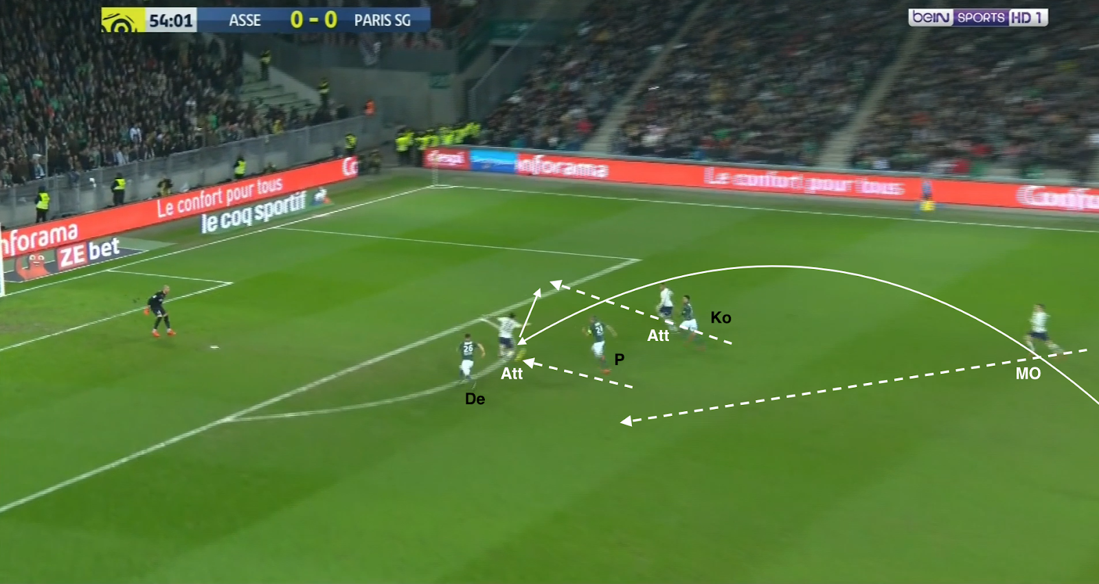 Nous avons pu voir sur les trois exemples précédents des attaques placées et des contres des deux équipes. Et il y a une nette différence : les Parisiens ont réussi plus souvent ce qu'ils ont essayé de faire. Mais l'exemple illustrant le mieux les différences entre les deux équipes intervient à la 54e minute, avec l'ASSE qui bénéficie d'un coup franc :