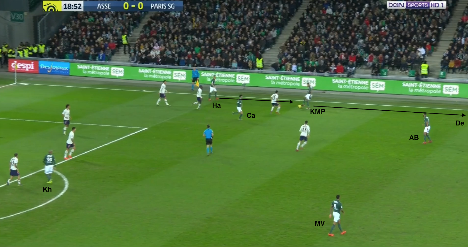 Malheureusement les Verts attaquent en infériorité numérique : Hamouma est suivi par 3 défenseurs et ses seuls soutiens sont Cabella à l'autre bout du terrain et Silva, Khazri et KMP sur la ligne médiane. Il est donc obligé de temporiser, ce qui laisse le temps à la défense de se remettre en place :