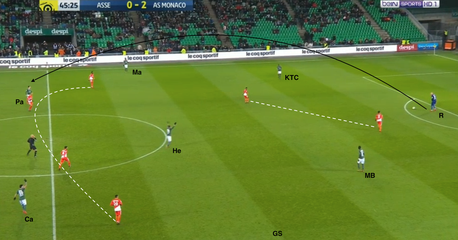 Sur cette image on remarque le (4-)4-2 Monégasque et le 4-3-(3) Stéphanois, avec un Hernani pointe basse qui demande le ballon, sans être servi. C'est Pajot qui est recherché par son gardien, il gagne son duel de la tête, mais un défenseur adverse dégage en touche.
