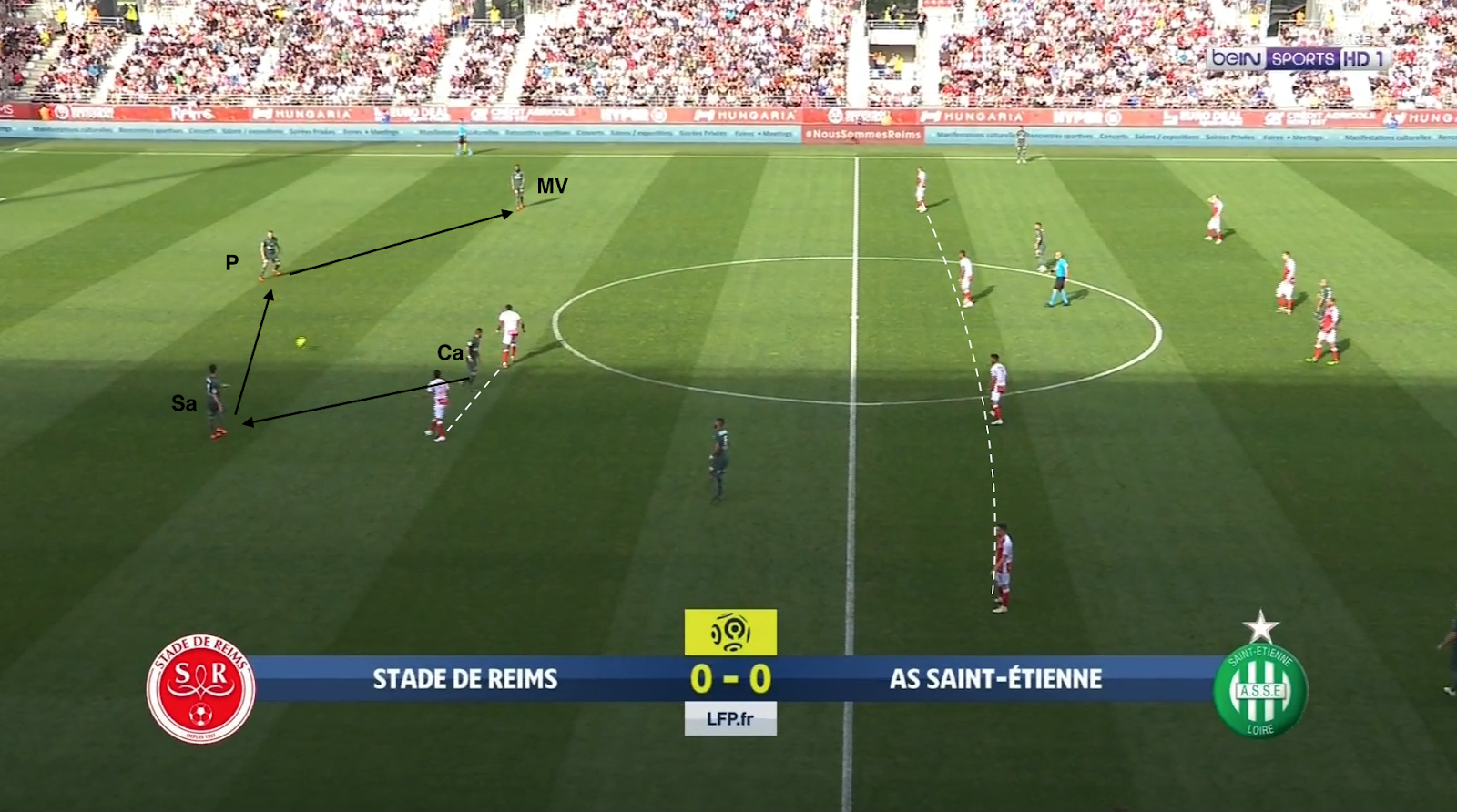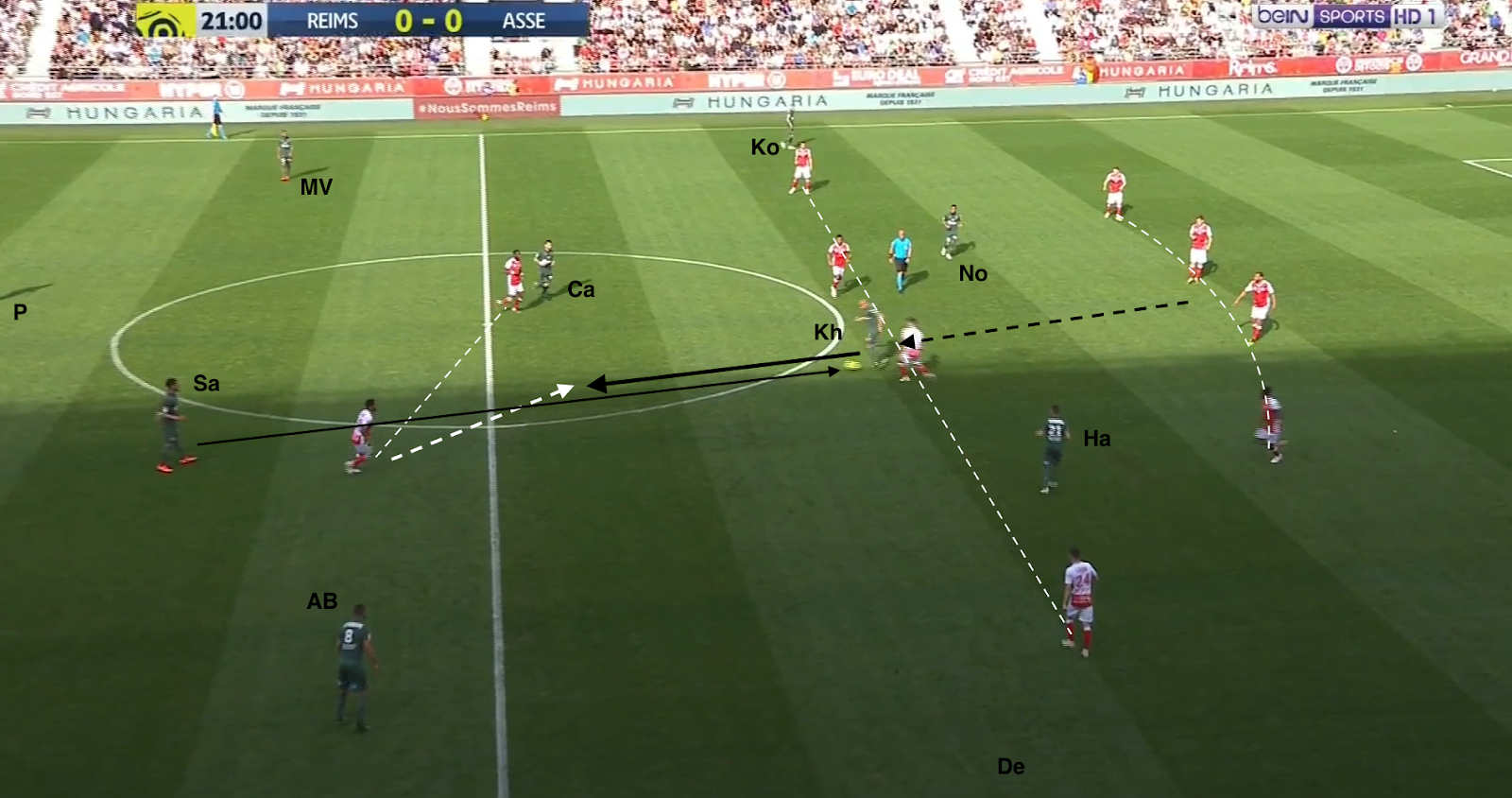 Les Verts ont ouvert le score suite à un pressing qui a poussé le gardien adverse à la faute. Et ils l'ont majoré en provoquant de nouveau des fautes techniques chez leurs adversaires. Cabella perd un ballon en duel contre un défenseur, mais se bat pour le récupérer - il y arrive, les Stéphanois combinent dans la surface avant qu'un défenseur dévie le tir de Khazri dans le but. Tout de suite après, à la 53e minute, le Stade de Reims construit une attaque contre le bloc en 4-4-2 de l'ASSE :