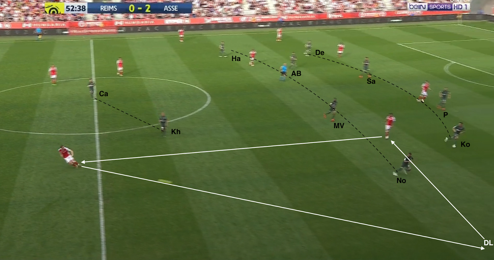 ... avant de lui redonner le ballon, qui est ensuite écarté vers la gauche via Perrin et M'Vila. Le bloc rémois est très discipliné, la ligne de 4 milieux et celle de 2 attaquants coulissent de gauche à droite sans laisser le moindre espace. Cabella fait de nouveau un appel entre ces deux lignes...