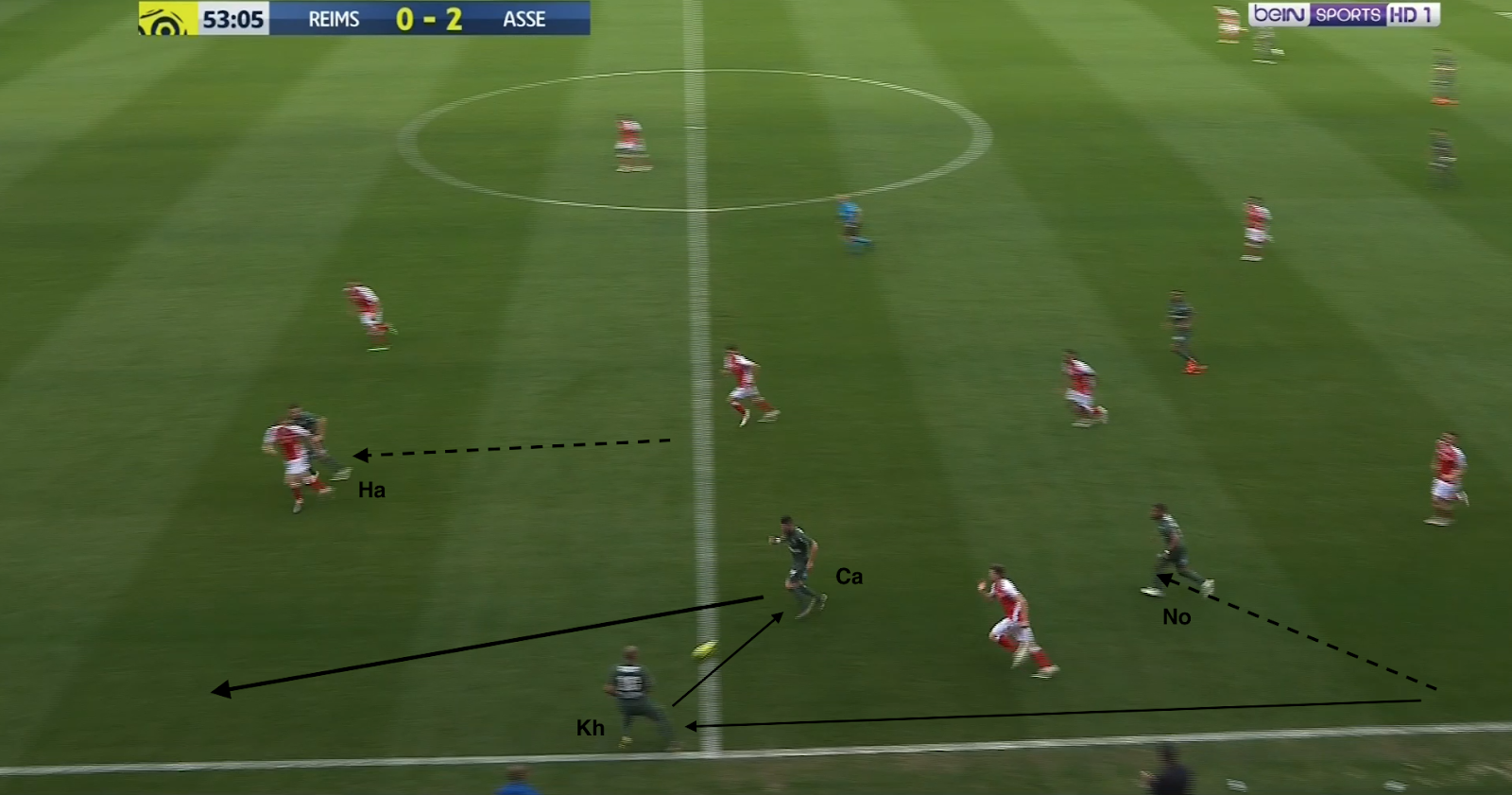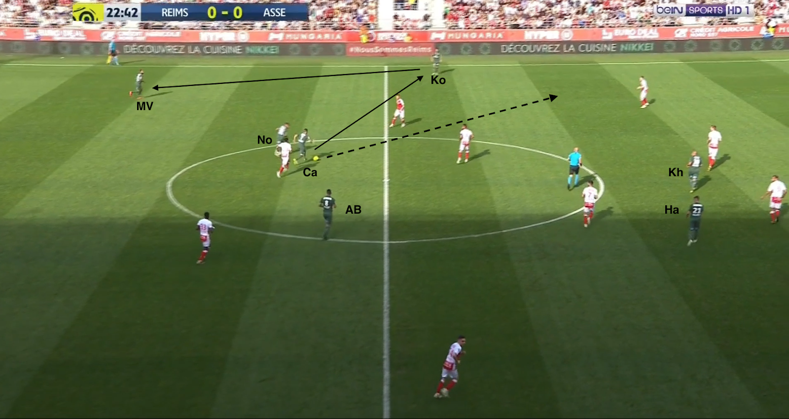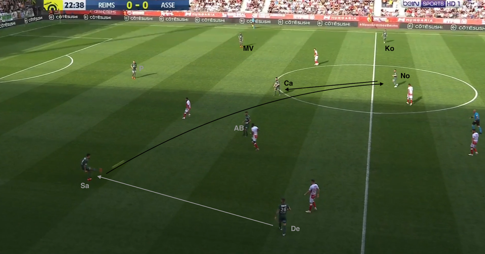 Aït Bennasser demande le ballon et M'Vila et Saliba font aussi des grands signes - ce qu'il faut faire est évident. Et les Verts le font proprement, Debuchy est lancé dans le couloir droit :