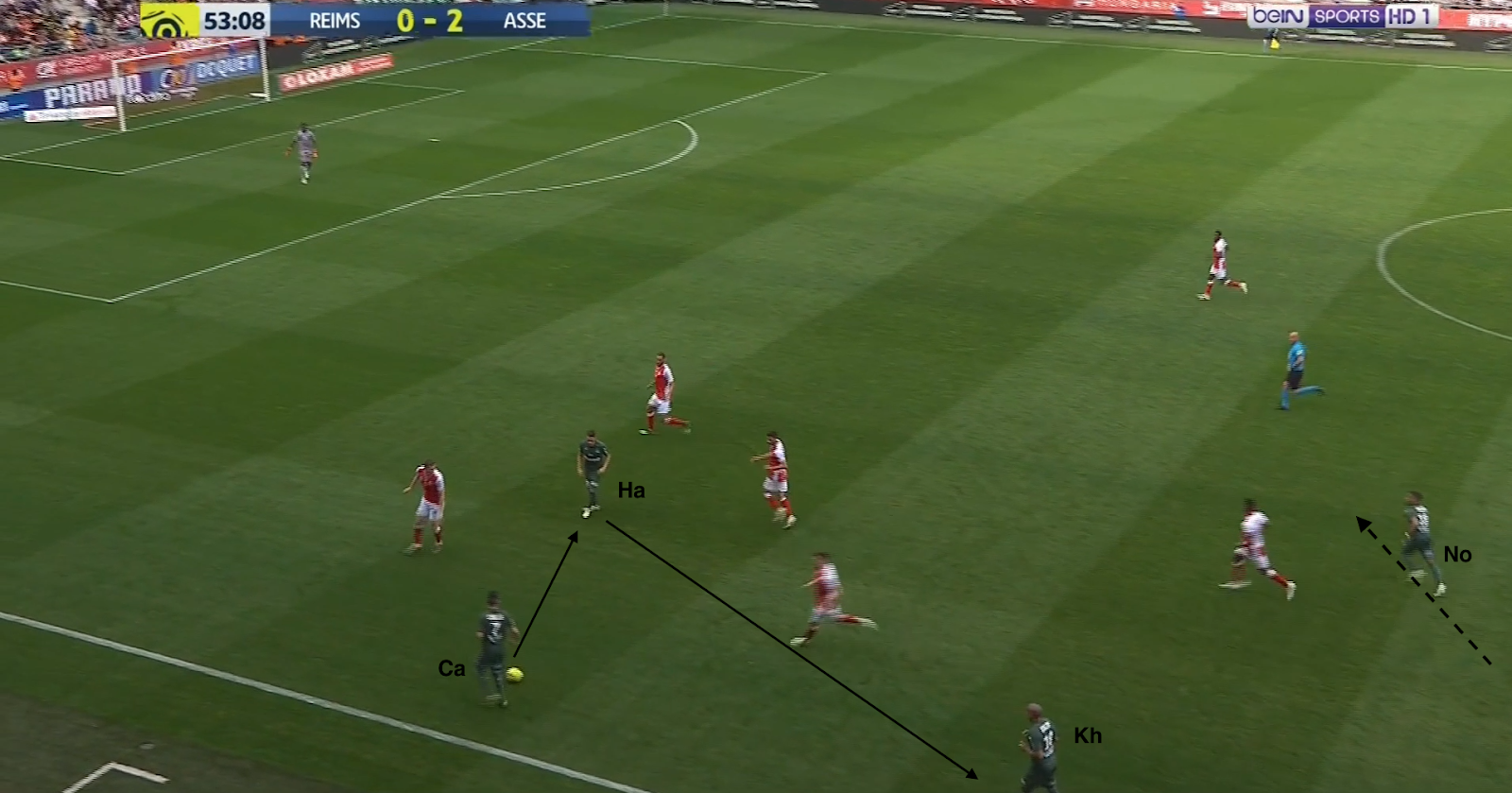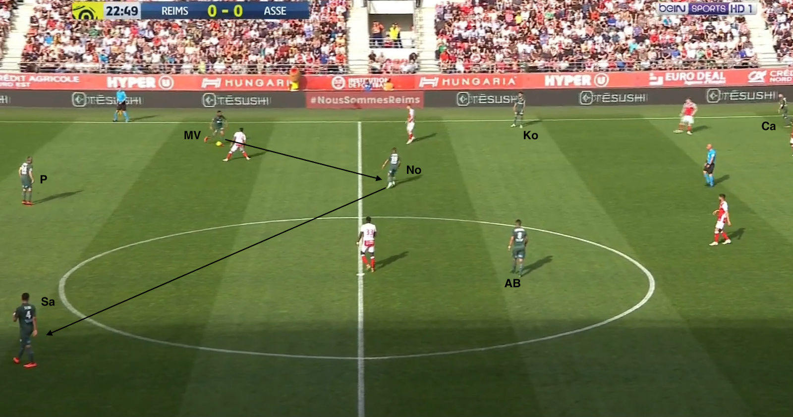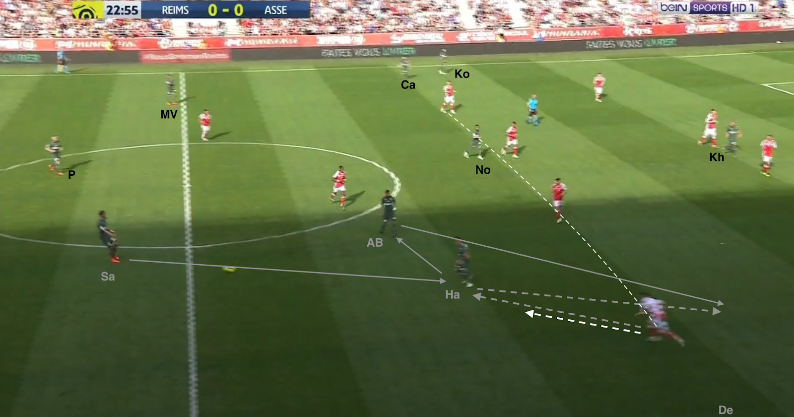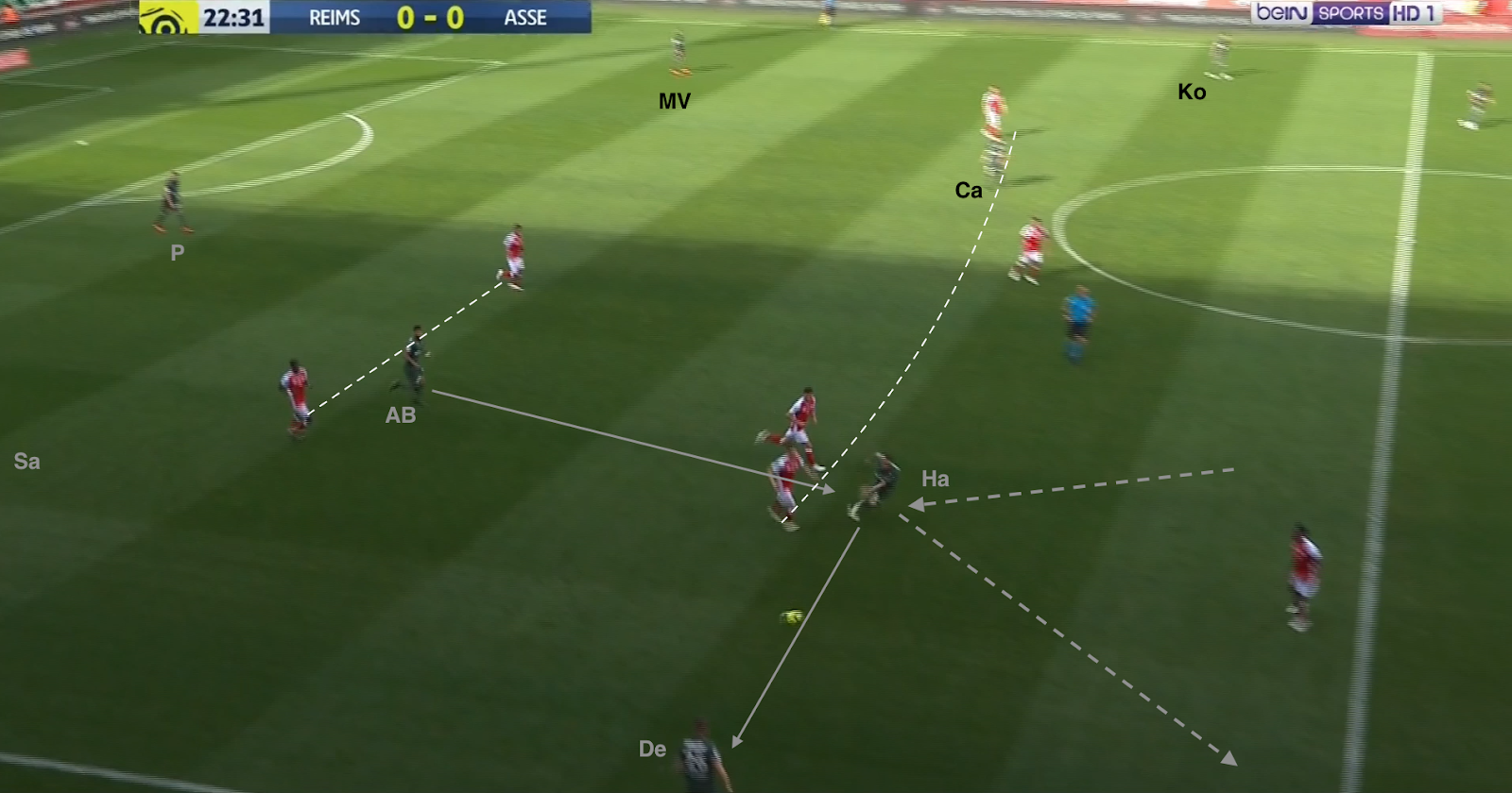 Aït Bennasser demande le ballon et M'Vila et Saliba font aussi des grands signes - ce qu'il faut faire est évident. Et les Verts le font proprement, Debuchy est lancé dans le couloir droit :