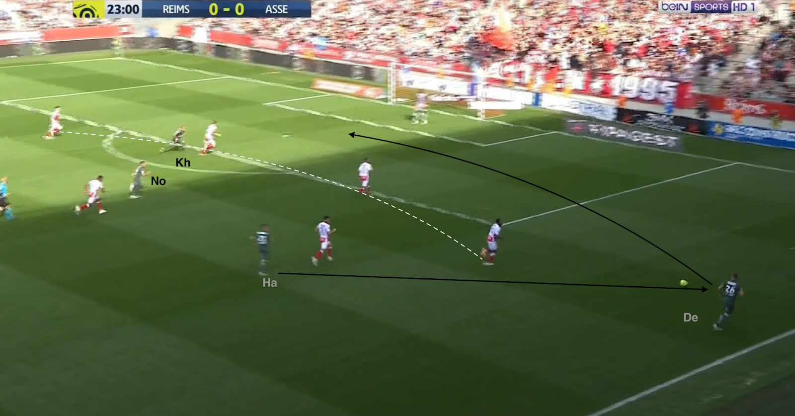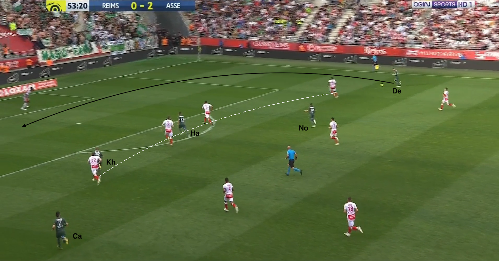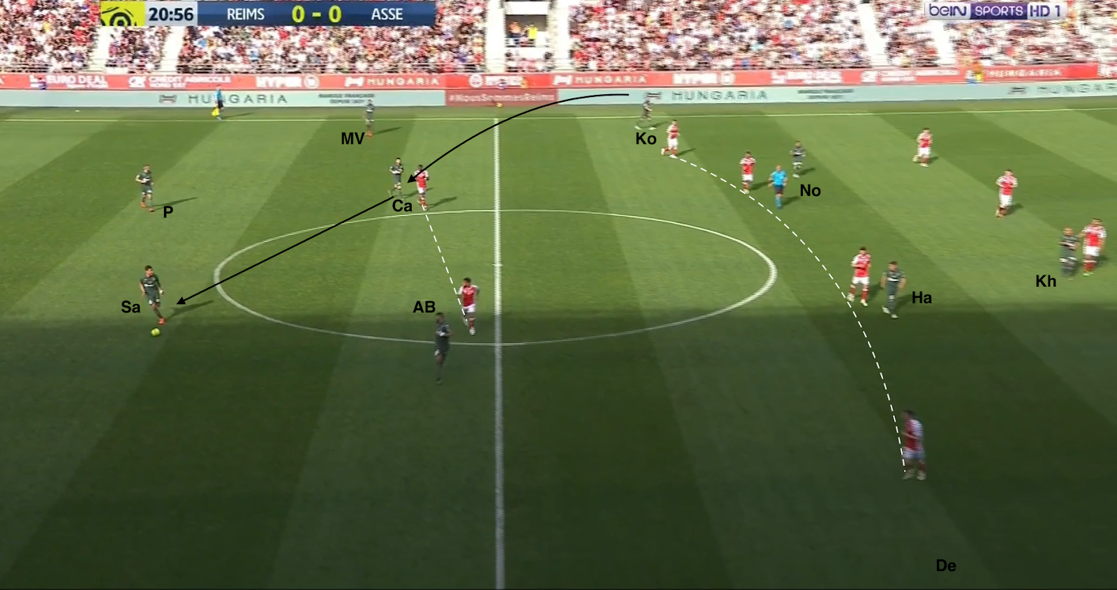 Il écarte avec Kolo, qui trouve Hamouma. Quand les Verts n'avaient pas le ballon, l'ailier droit était bien en place dans son couloir. Dès qu'ils l'ont récupéré, il a fait un appel pour déclencher le contre. Il est taclé par un défenseur...