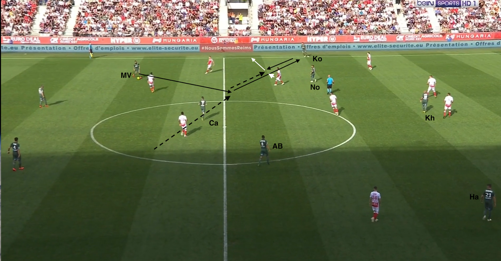 ... qui écarte à gauche avec Kolo, avant de se projeter plus haut dans le même couloir. Les côtés changent mais se ressemblent, le latéral préfère jouer en arrière, avec M'Vila. Il trouve Nordin entre les lignes...