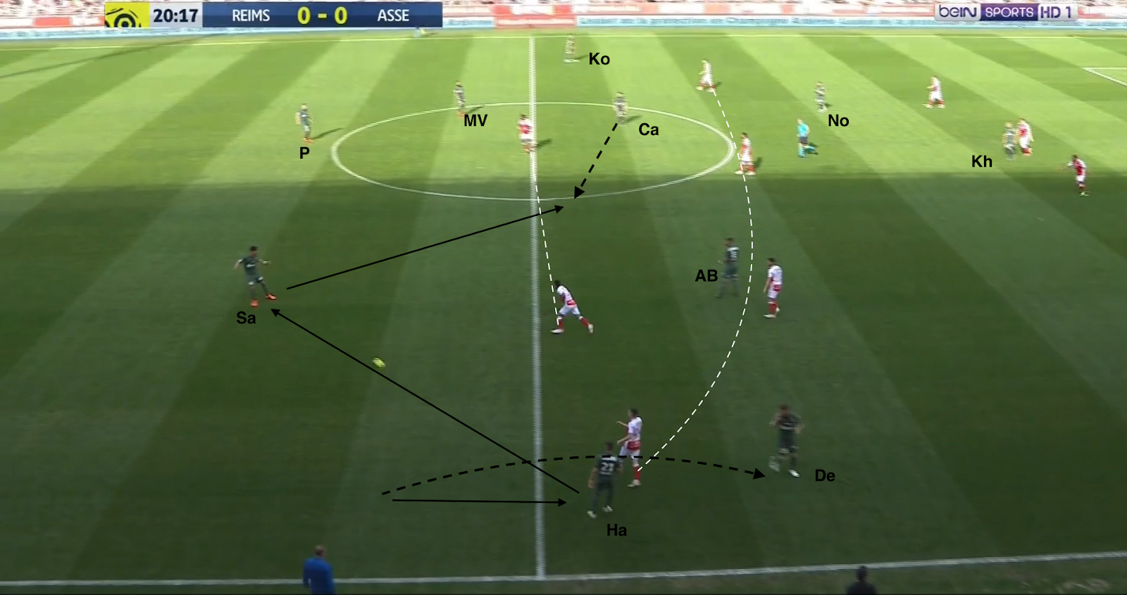 Son centre à destination de Hamouma et Khazri est capté par le gardien adverse. Pour le reste du match, les quatre offensifs stéphanois se sont fait plaisir à chaque récupération de balle, dézonant beaucoup et combinant entre eux, comme dans cet exemple. Les sorties de Nordin (remplacé par Polomat), Khazri (par Diony) et Hamouma (par Vada) ont cassé ce jeu, surtout que le système a été changé, laissant plus que Cabella et Diony (parfois Vada aussi) en vrais offensifs.