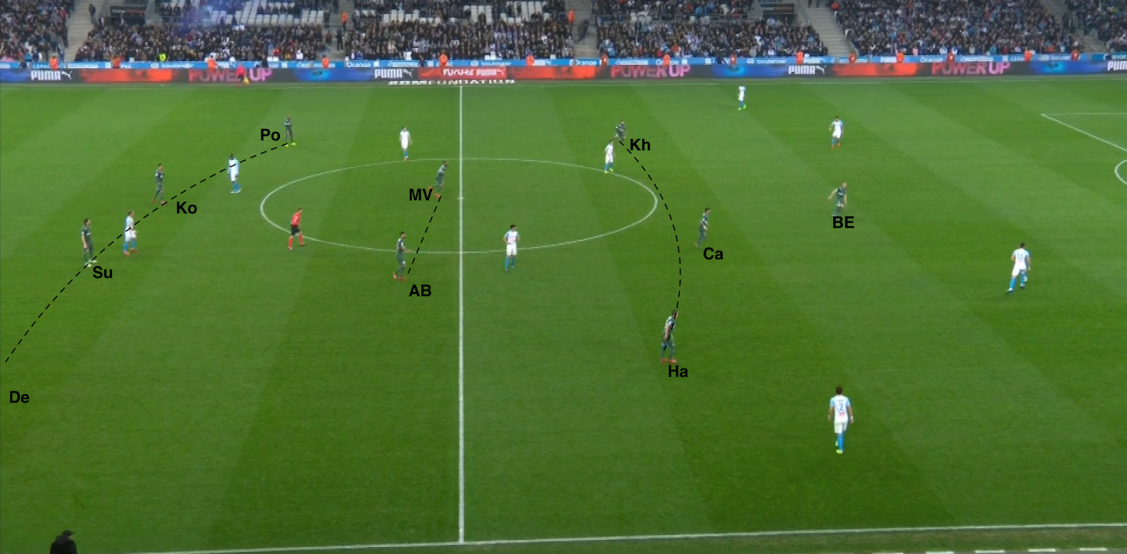 Subotic combine avec M'Vila, puis avec Aït Bennasser - les deux arrivent à transmettre le ballon proprement, malgré la pression de leur adversaire direct. Debuchy est recherché dans son couloir mais le milieu gauche marseillais sort et récupère le ballon. L'OM commence une attaque vers la gauche :