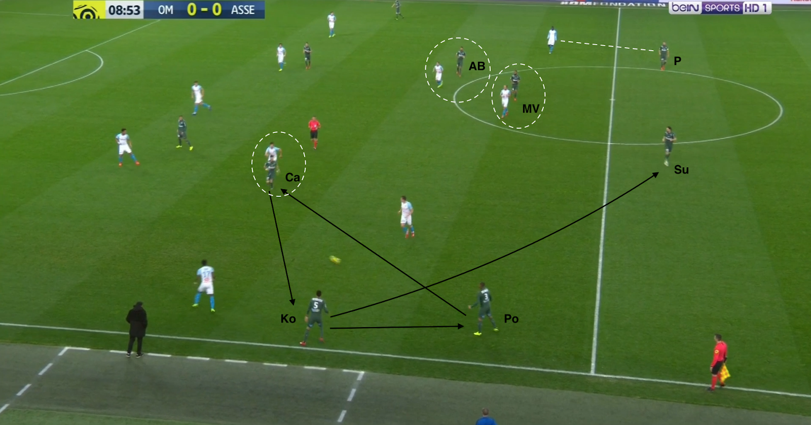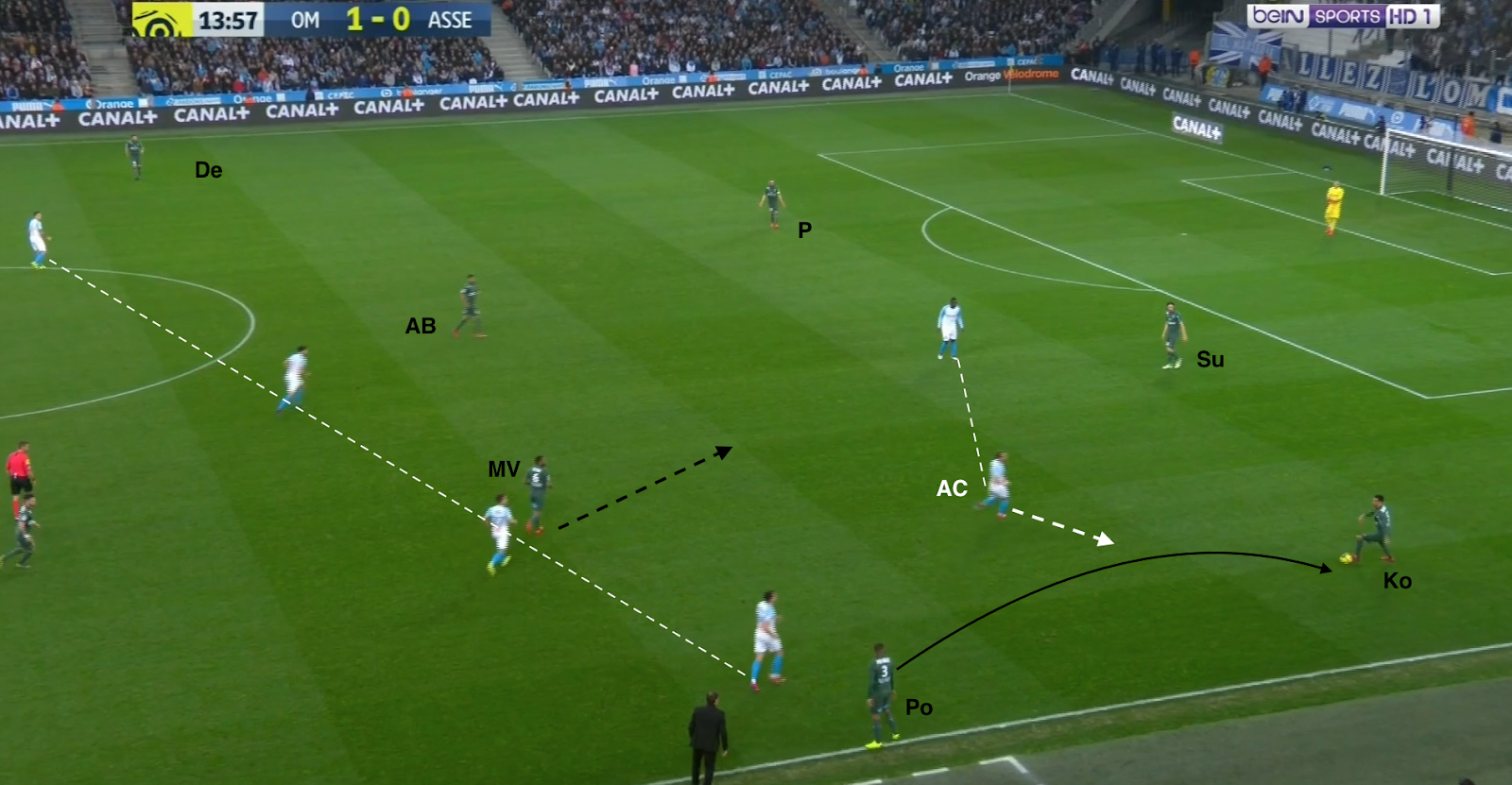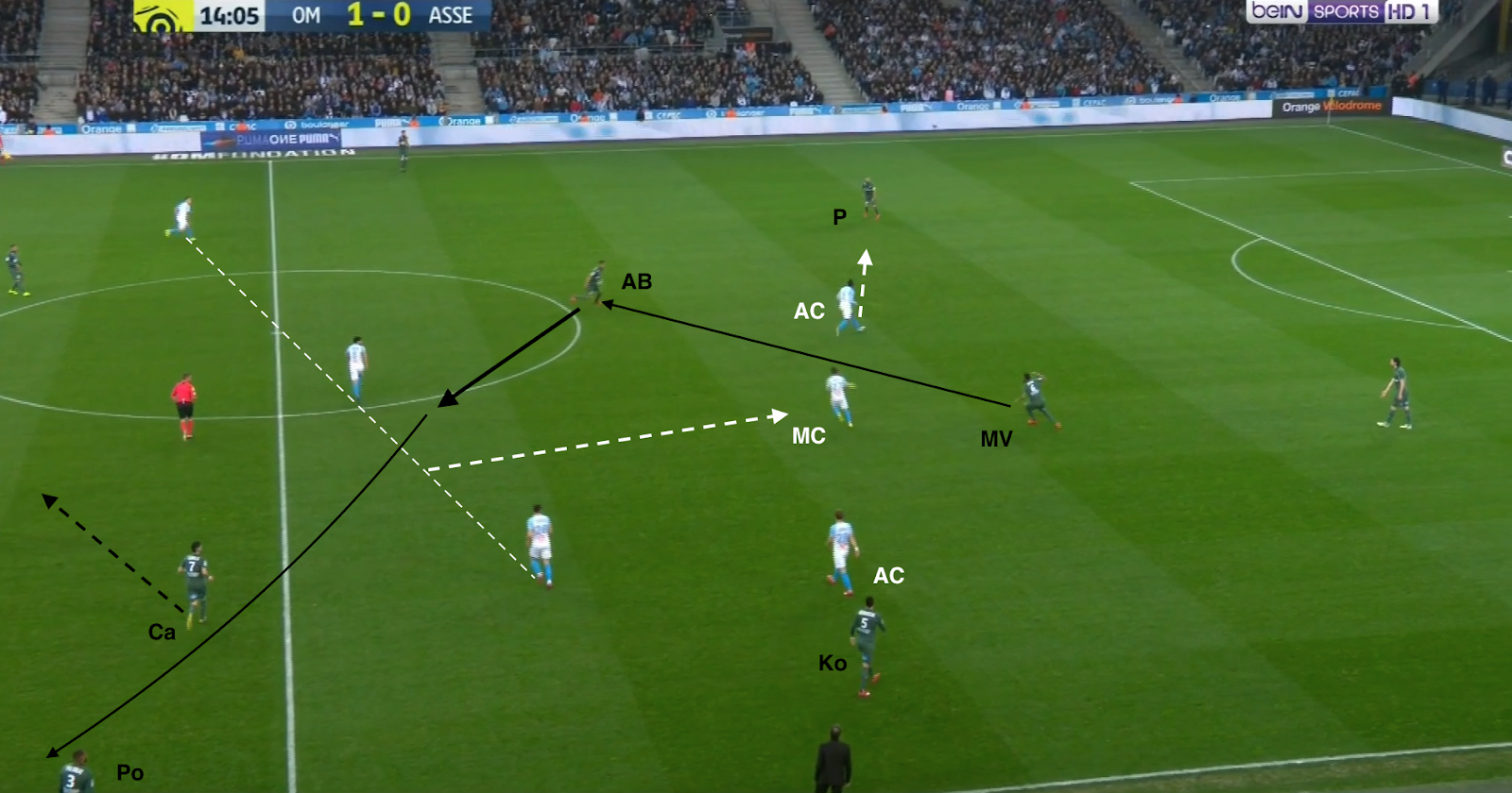 "Son" avant-centre reste à côté de Kolo pendant que l'autre est discipliné et s'en va chercher Perrin, ce qui libère un angle de passe vers Aït Bennasser. M'Vila est recherché par un milieu axial, ce qui permet aux Stéphanois de trouver Cabella et Polomat à gauche - dans deux passes les deux premières lignes du bloc marseillais ont été franchies. Cabella laisse le ballon aller vers le côté et fait un appel dans l'axe :
